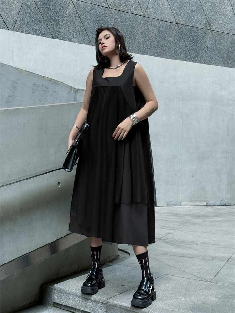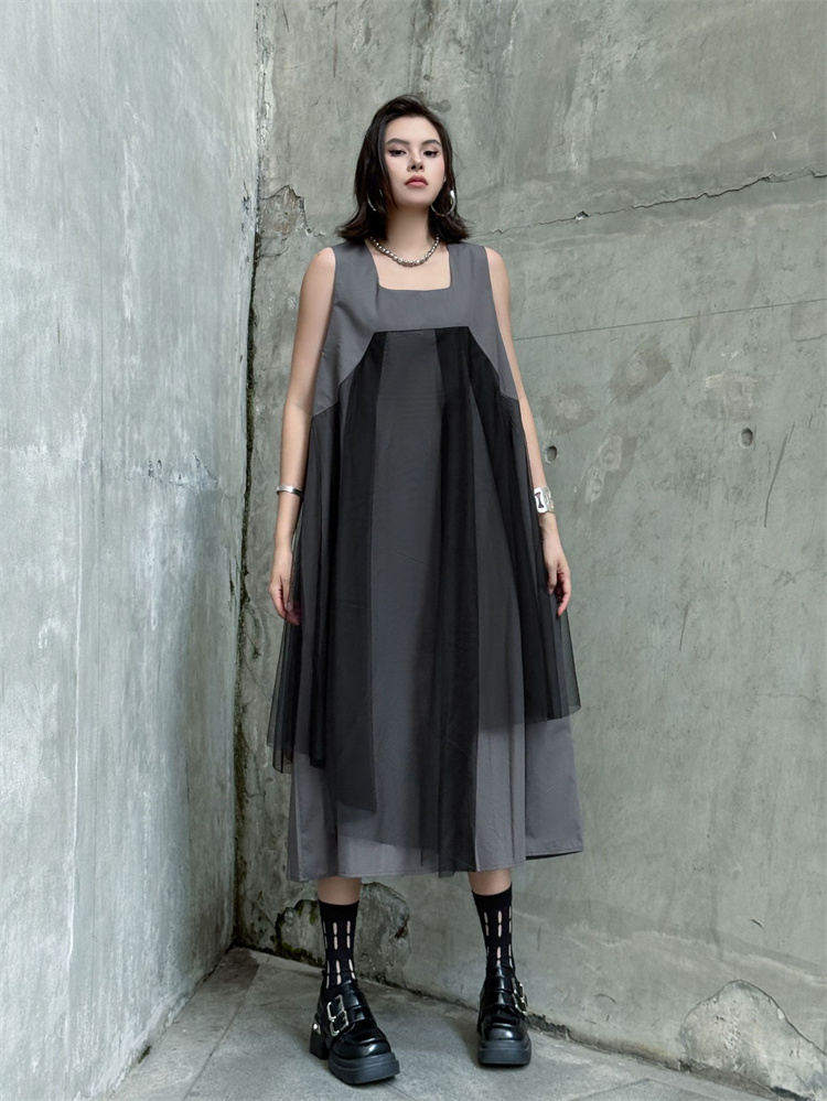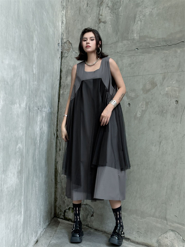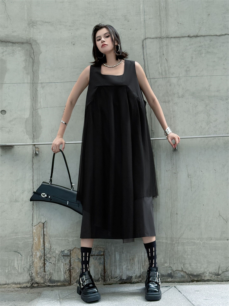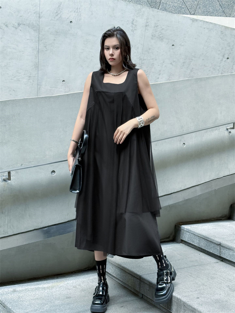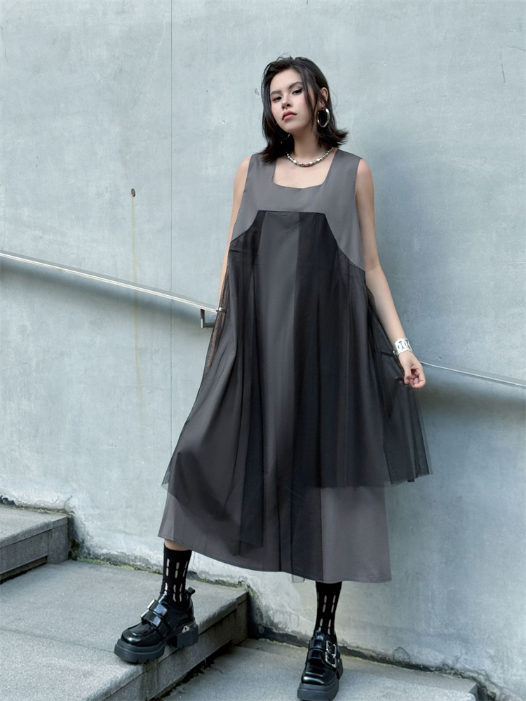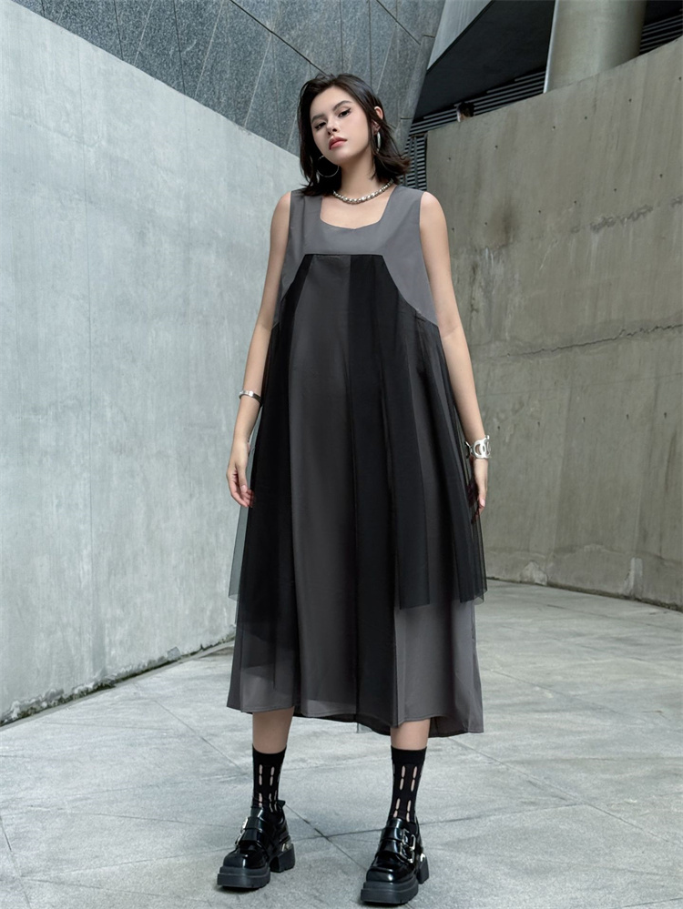 重ね着風デザインが印象的なノースリーブのロングワンピースです。