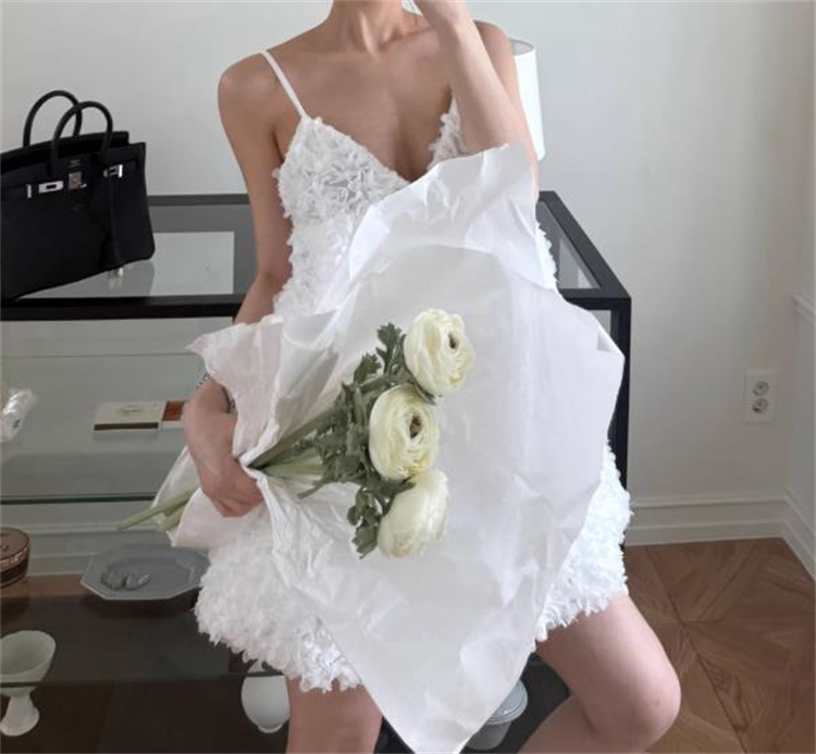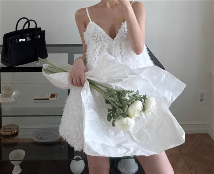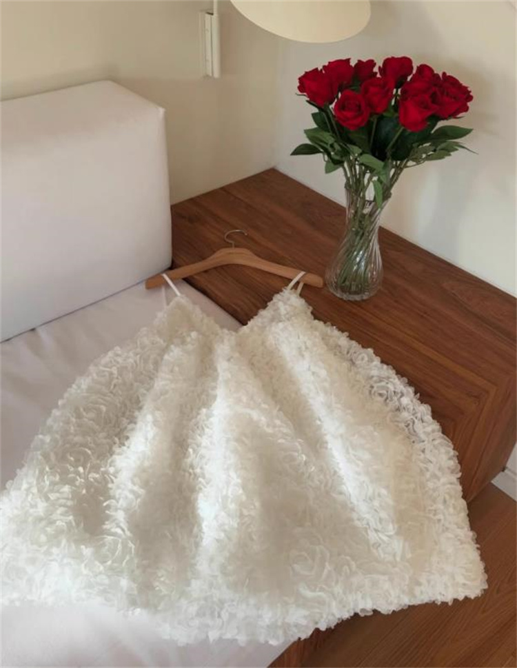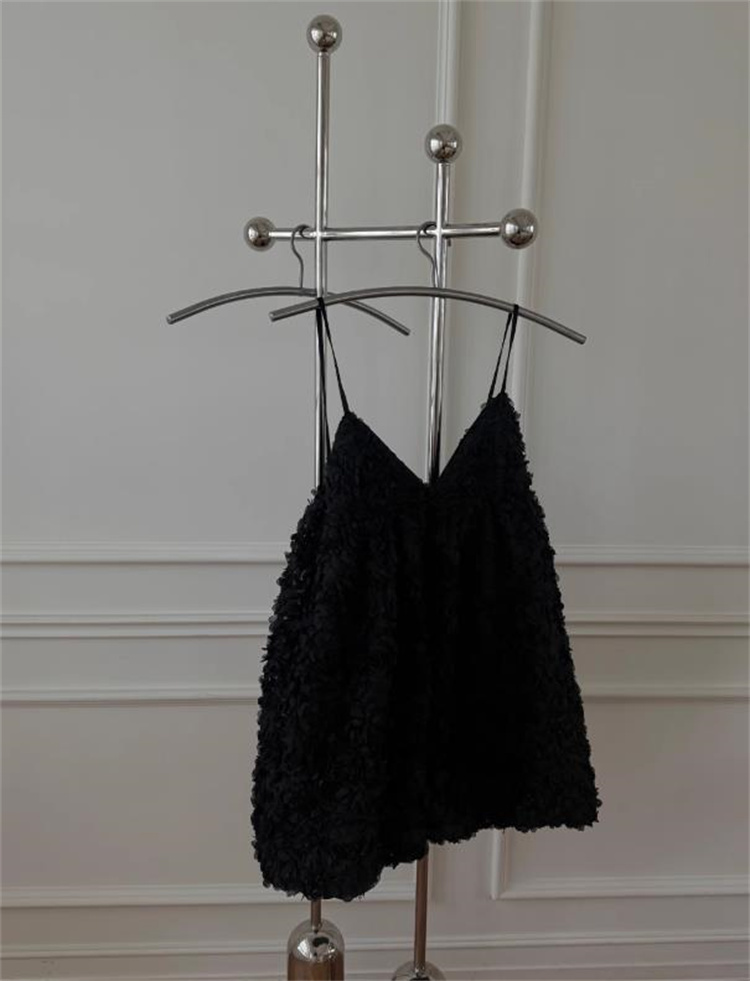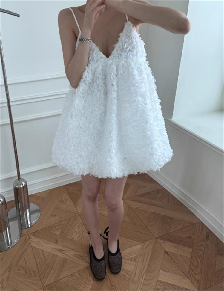 深襟でふわふわとした立体感のあるキャミソール型の袖なし一枚服です。