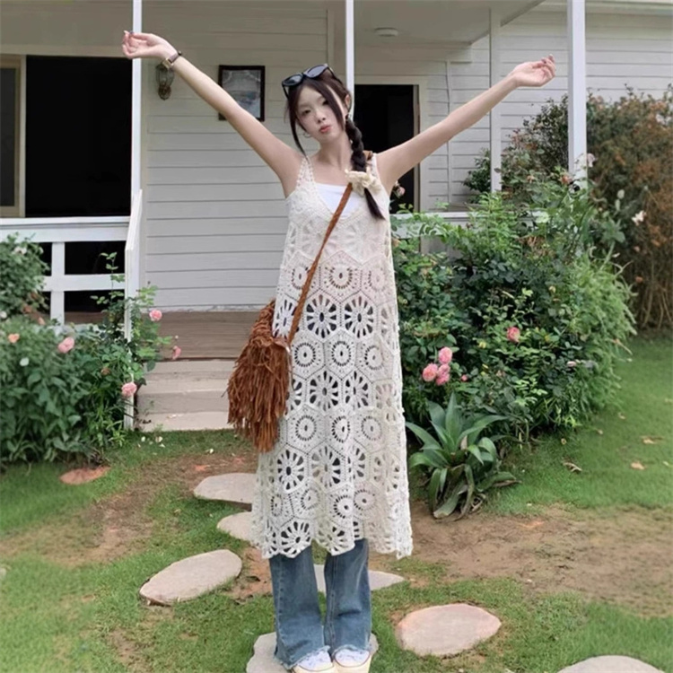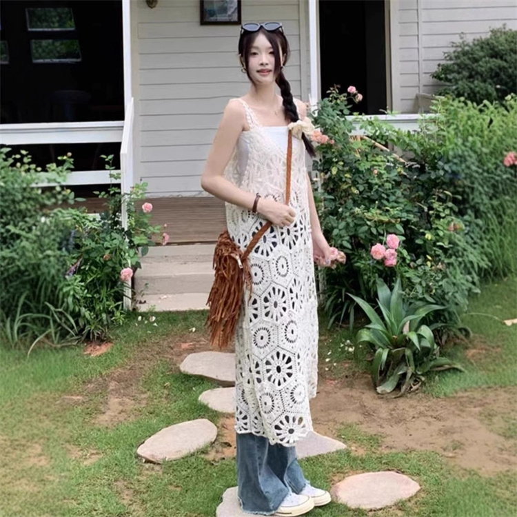 繊細なかぎ編み刺繍が美しいノースリーブのロングワンピース