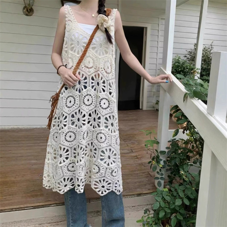 繊細なフックレースとレース編みが上品なVネックのノースリーブワンピース。ロング丈のシルエットがスタイルをすっきり伸ばし、透かし編みの素材で涼やかな着心地です。レトロな雰囲気の中に現代的なデザイン感をプラス◎オフィスやデートに差をつける一枚です。