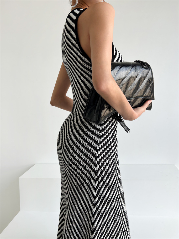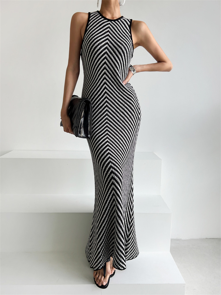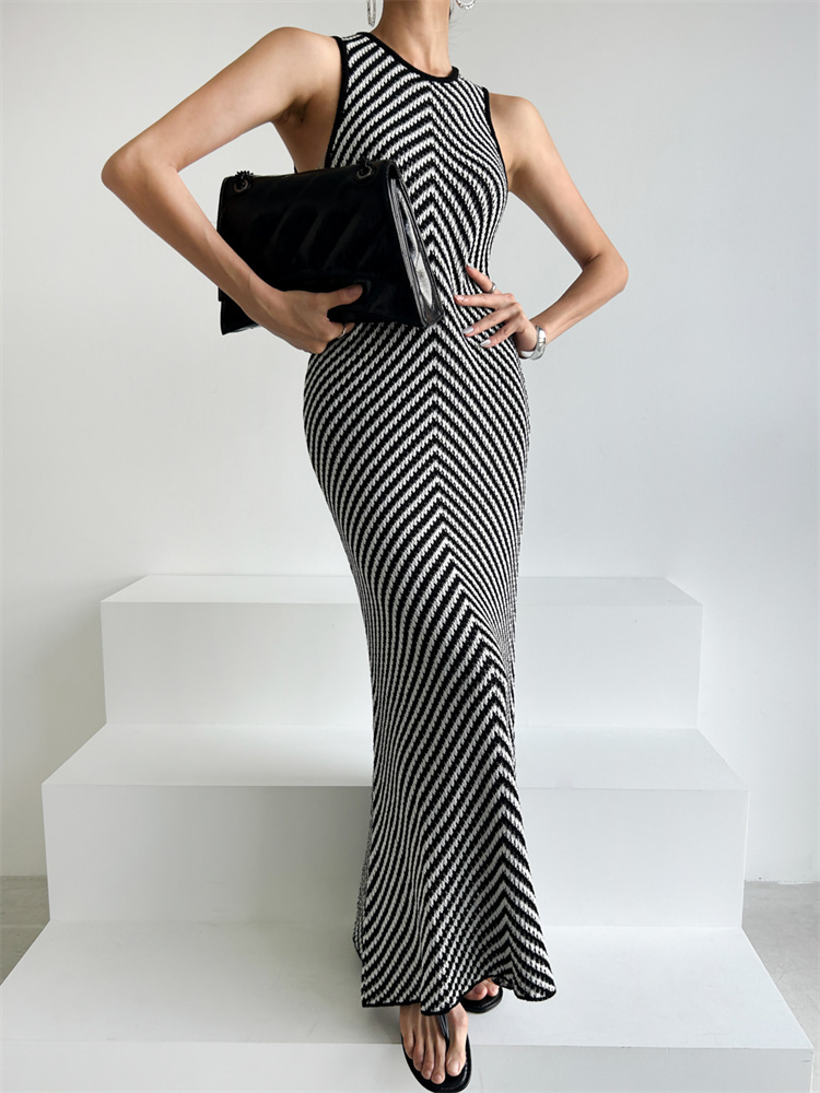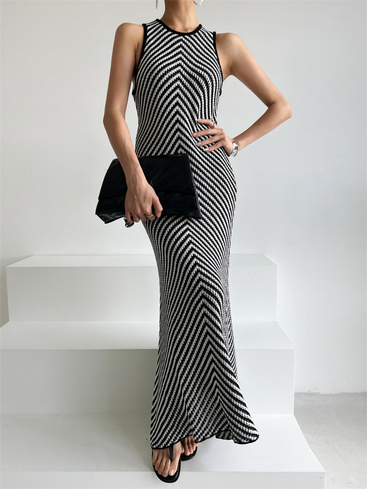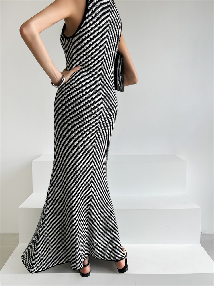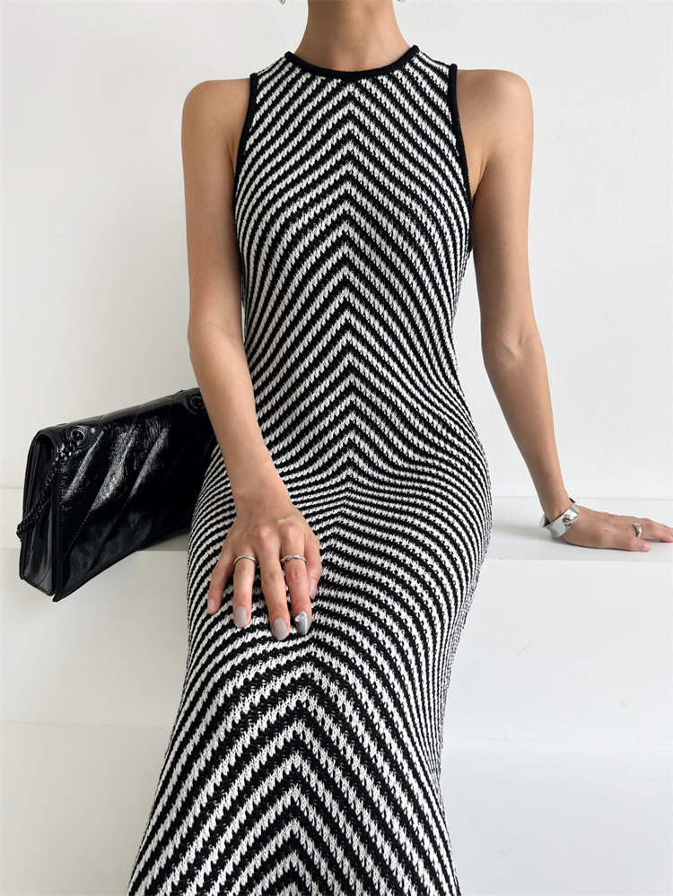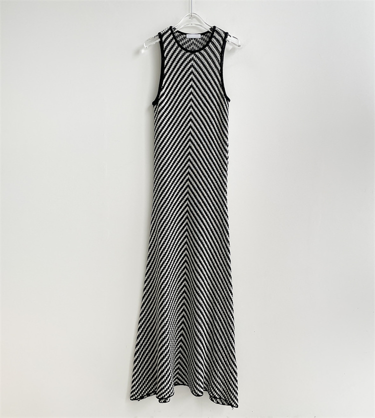2025年夏の新作!縞模様が美しいニット素材のロングワンピースです。 ノースリーブデザインで涼しく、体のラインを綺麗に見せる着痩せ効果も期待できます。 大人の上品な雰囲気を演出する長丈シルエットが魅力的。