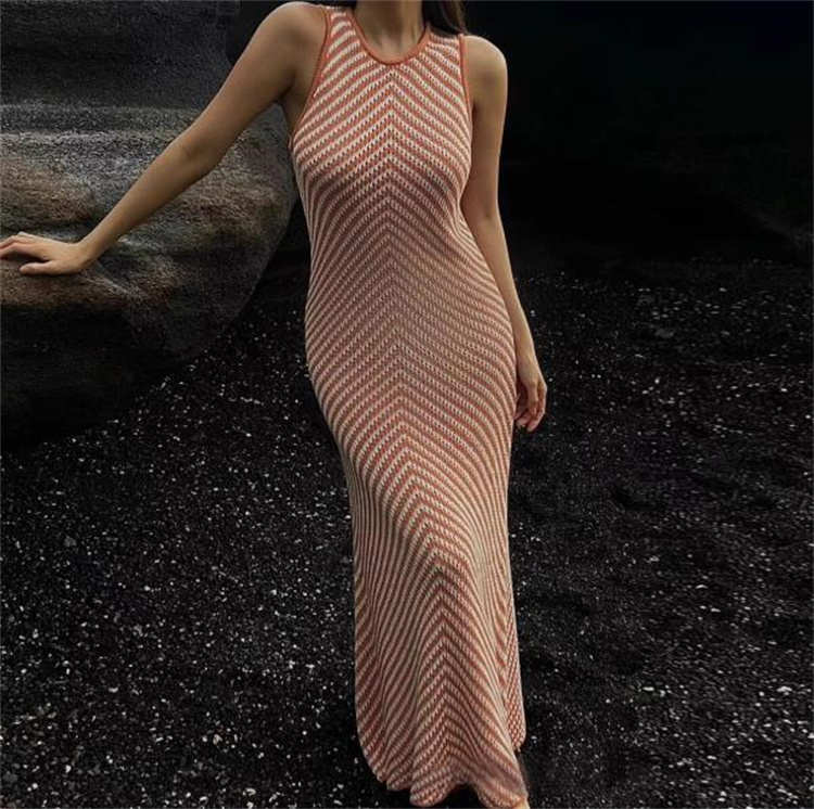 2025年夏の新作!縞模様が美しいニット素材のロングワンピースです。