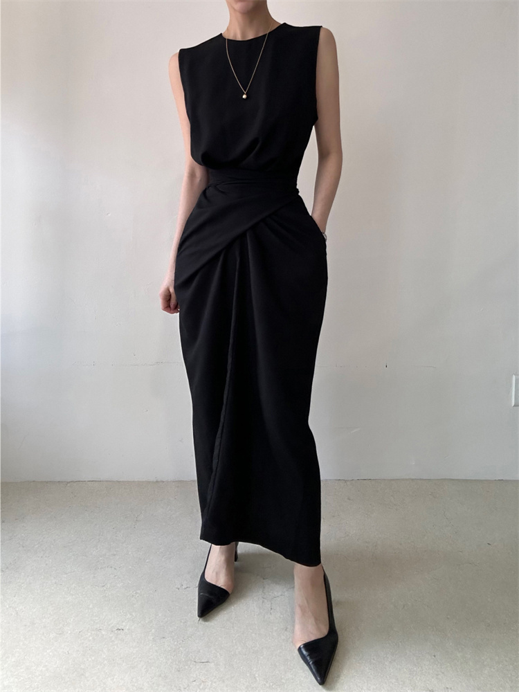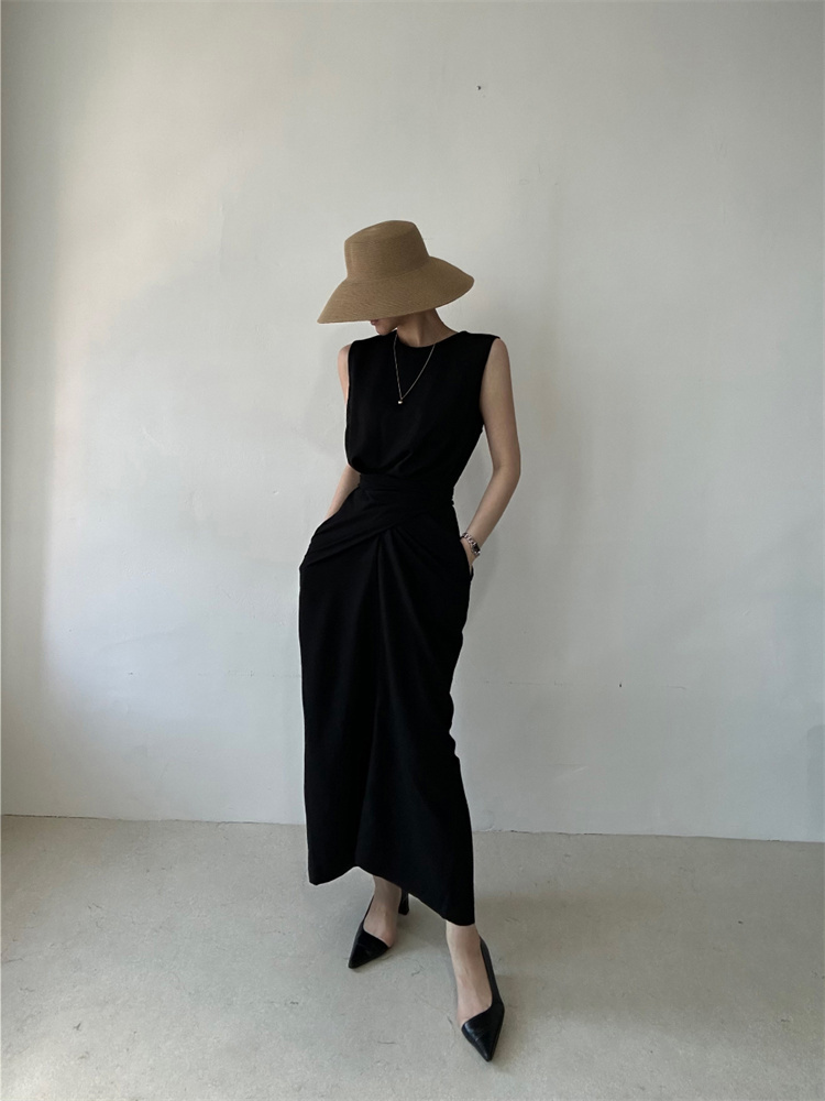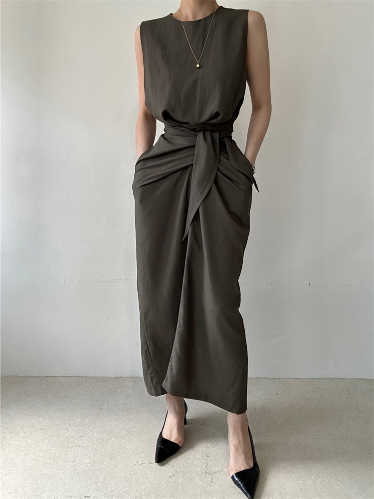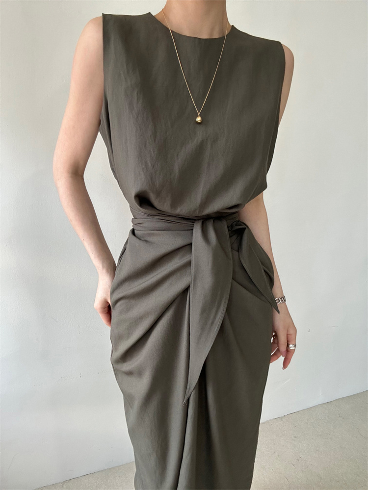 2025年夏の注目トレンド、結び目デザインが美しいノースリーブのロングワンピース。