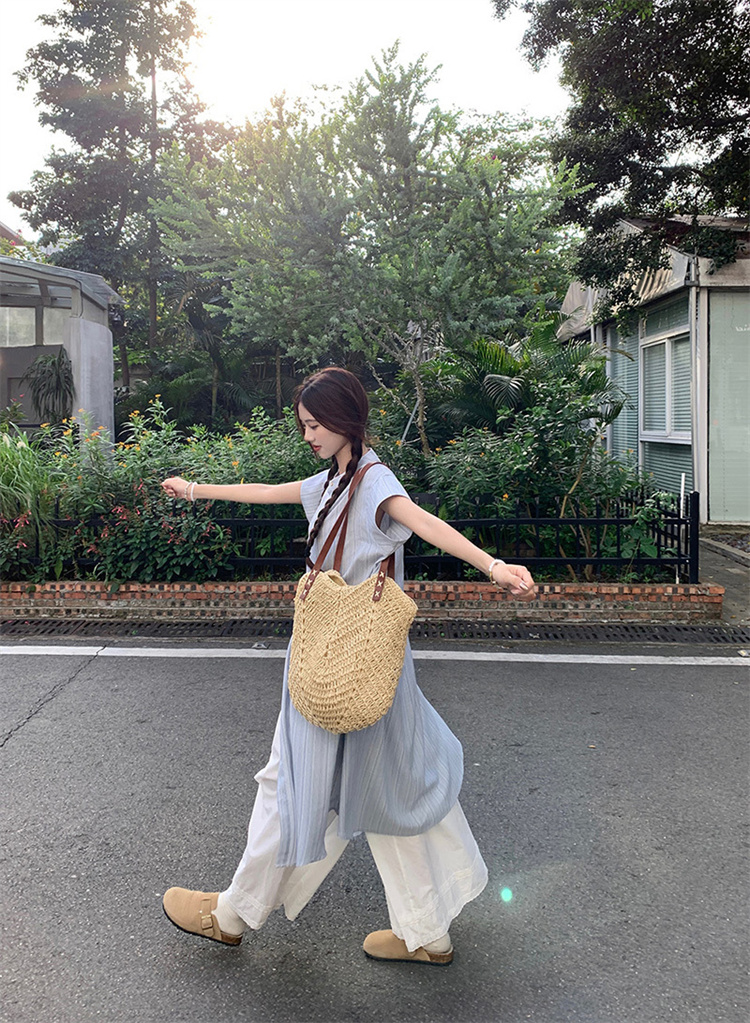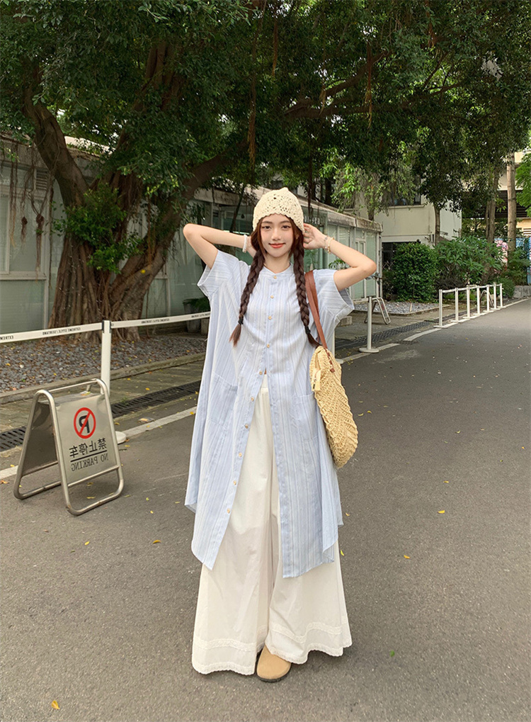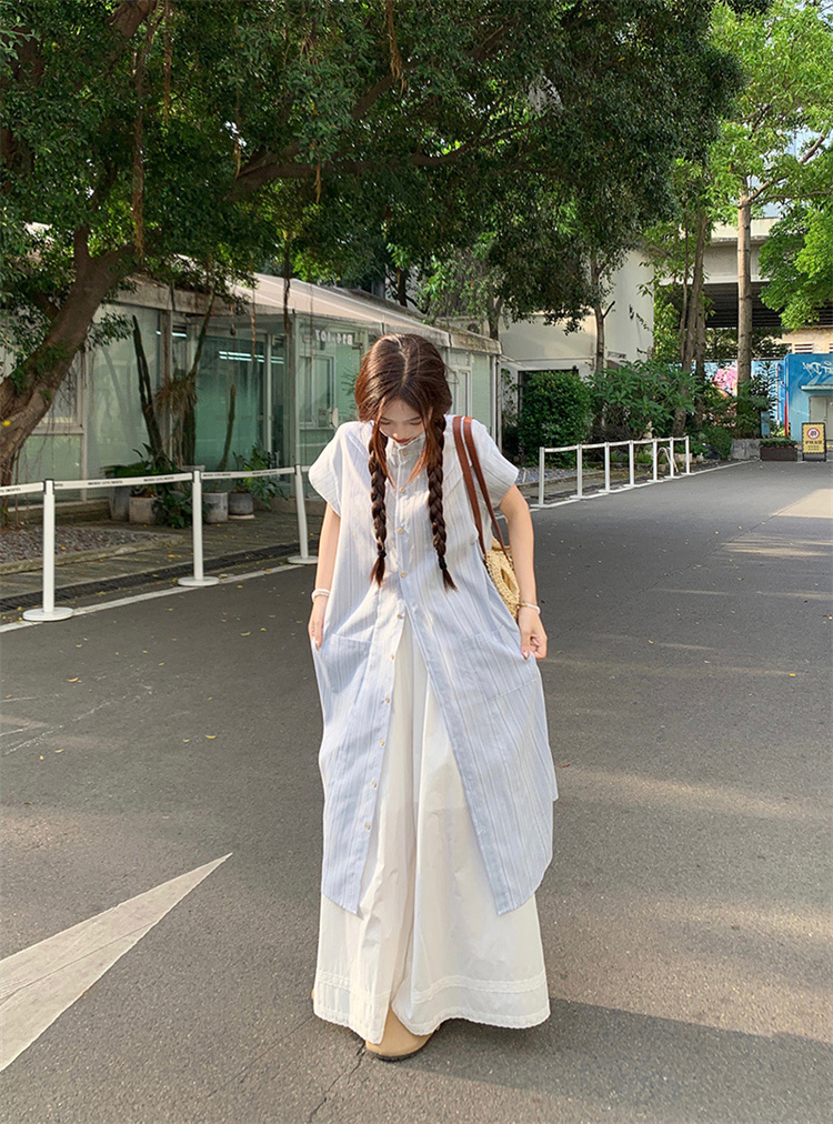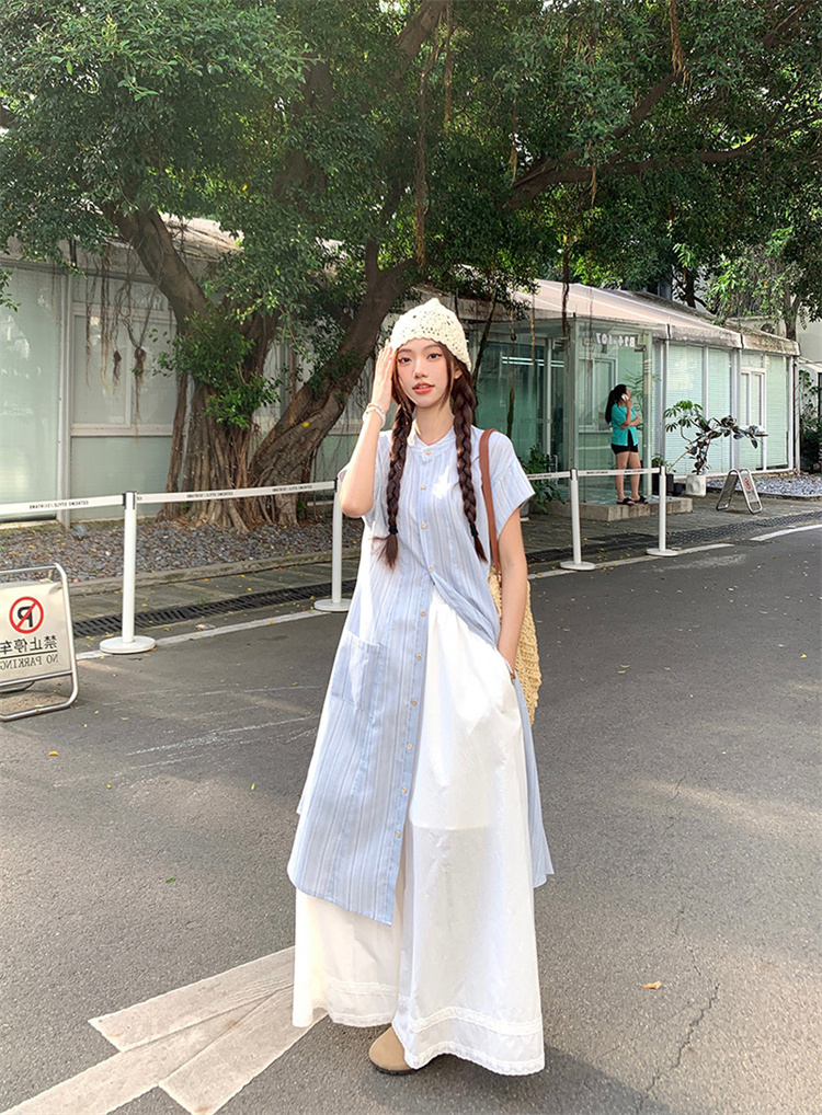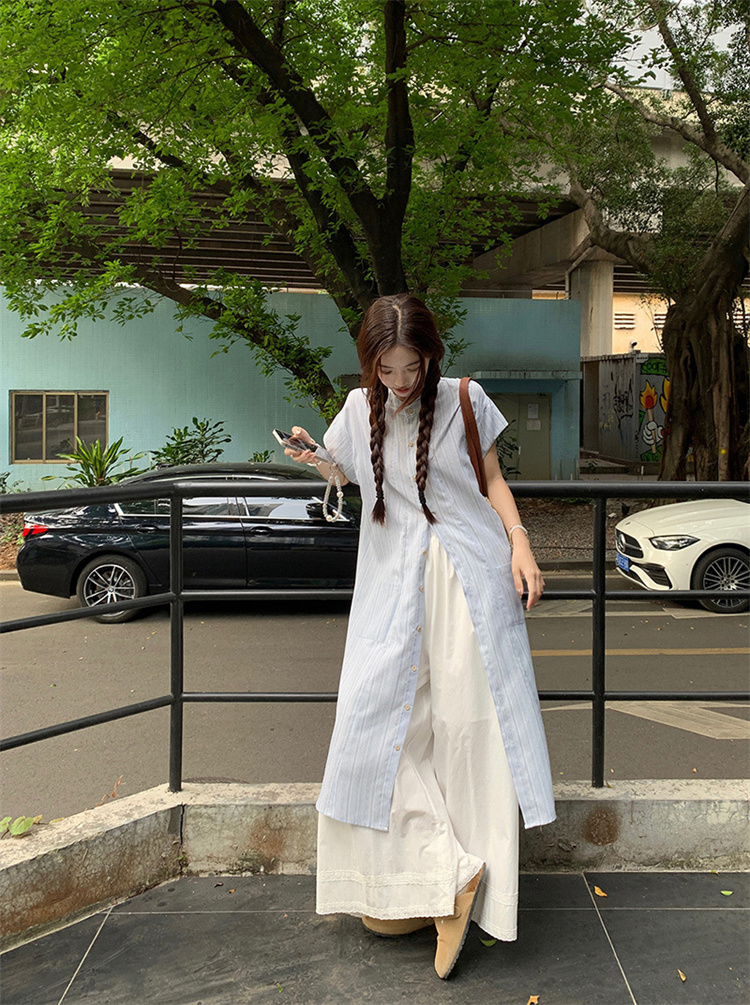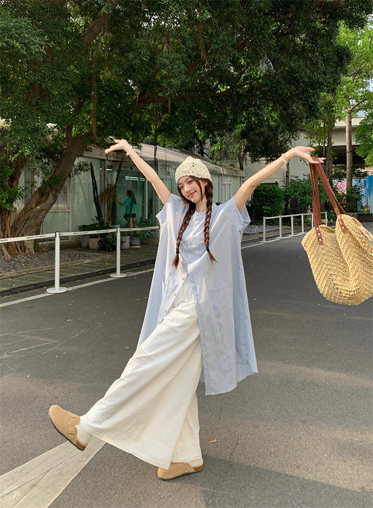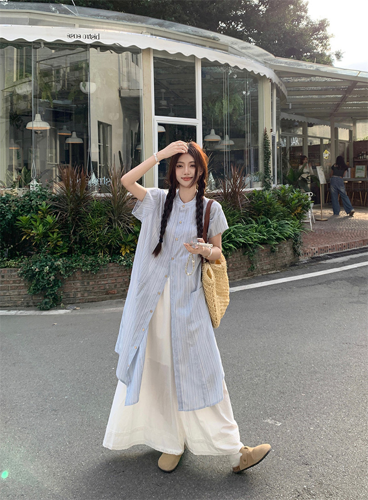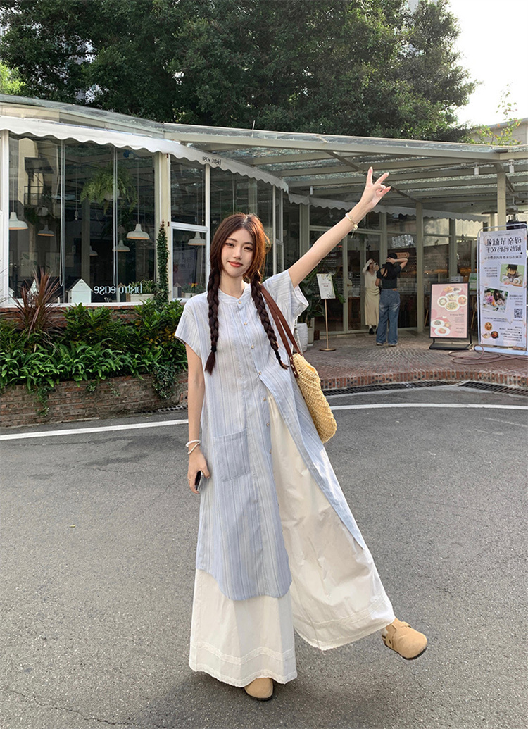 爽やかなストライプ柄のシャツワンピースとワイドパンツの2点セット。