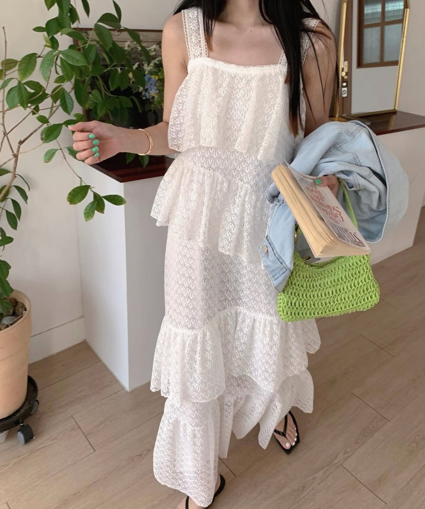 繊細なレース素材が美しいノースリーブのティアードロングワンピース。