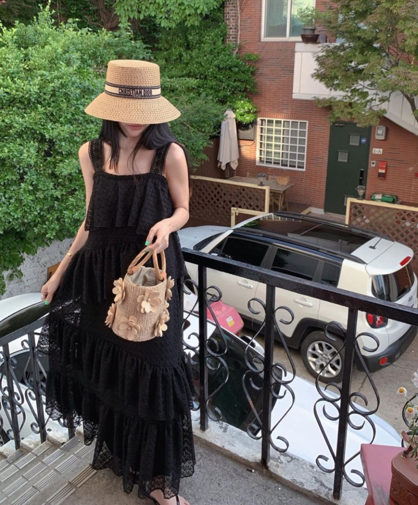 段々に重なる裾のデザインが上品で女性らしいシルエットを演出します。