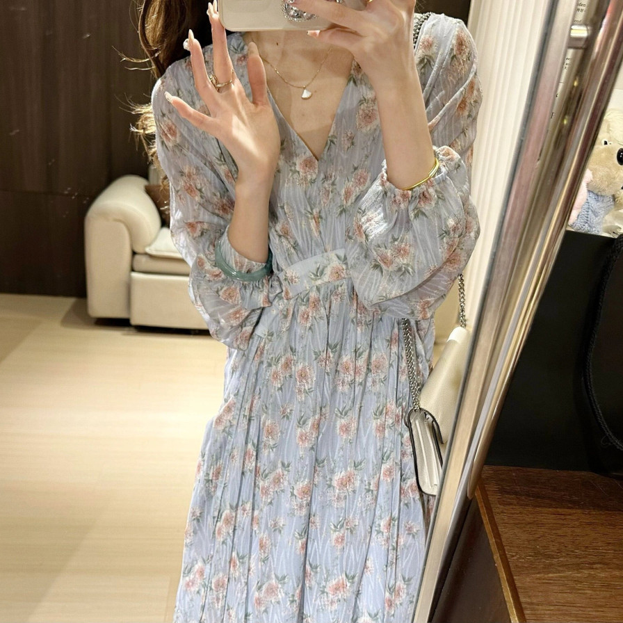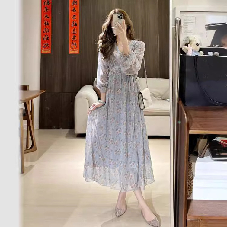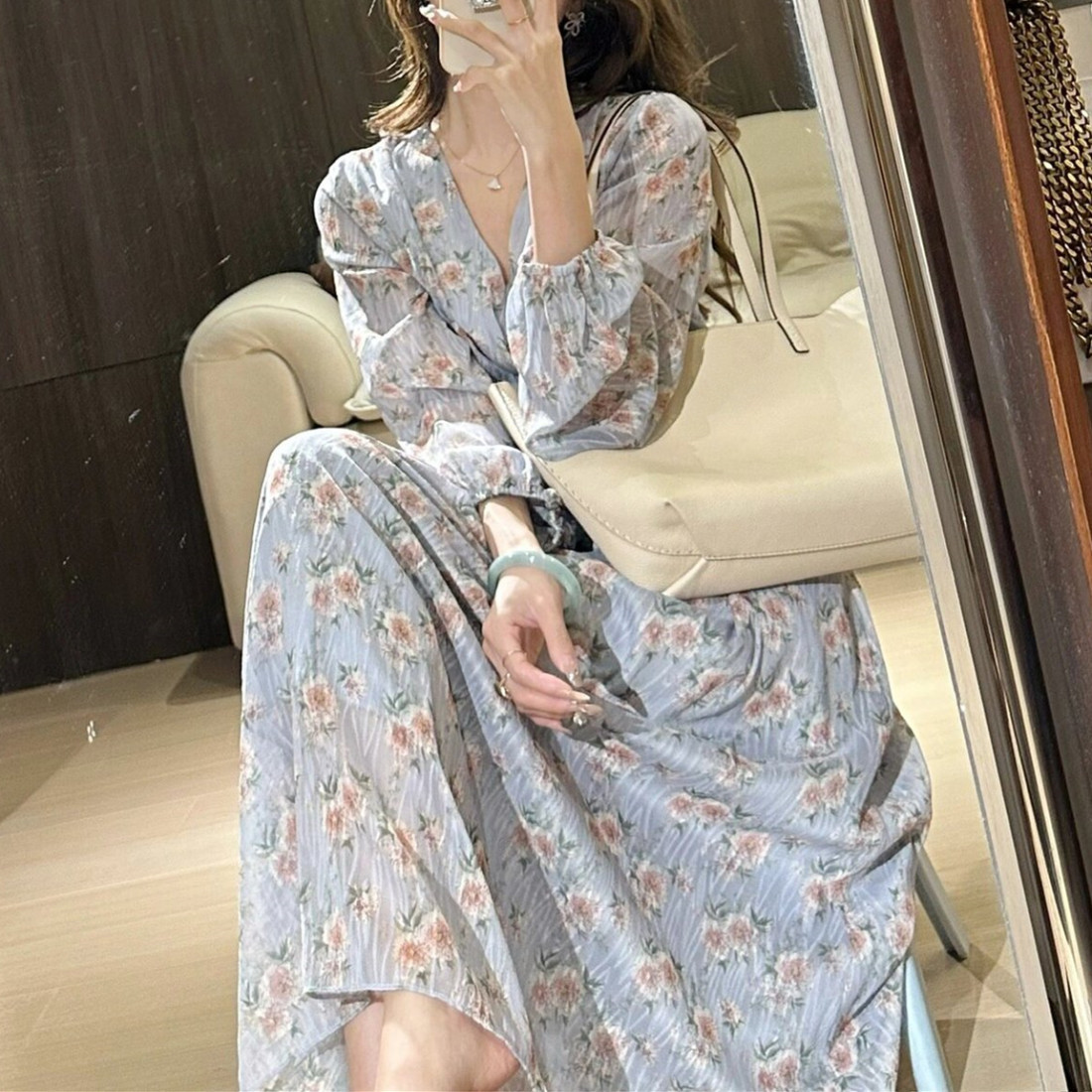 一枚できれいすっきり見え!花柄フレアロングワンピース。