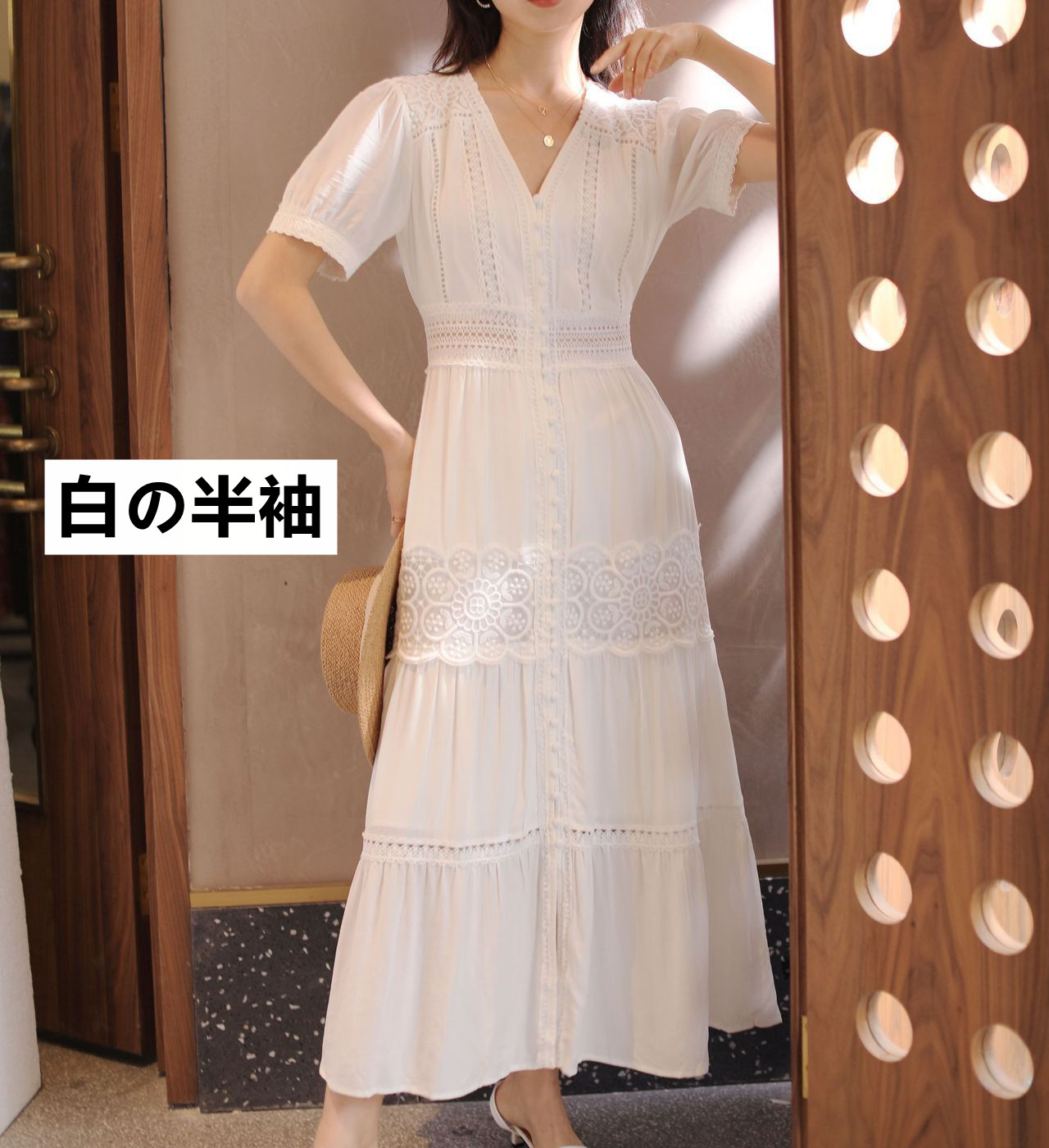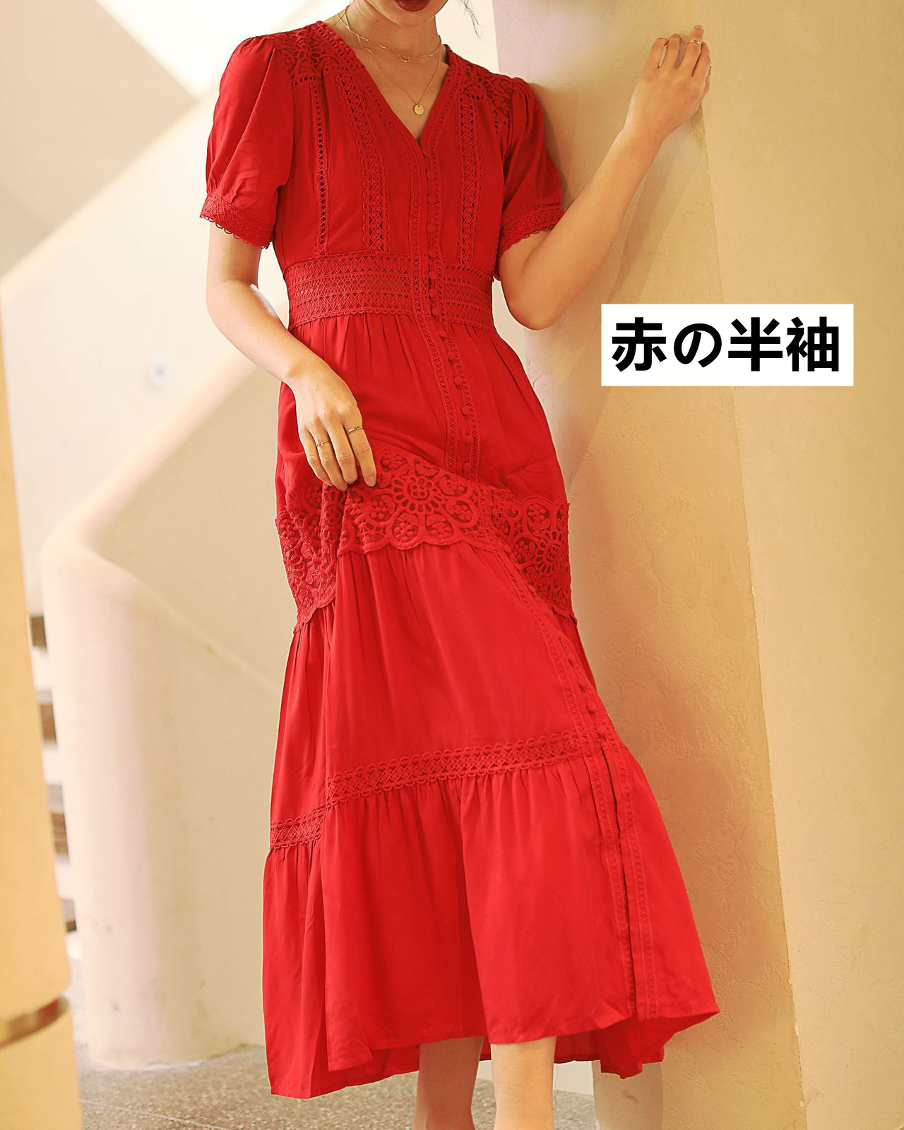 エレガントなブイネックと繊細なレースデザインが女性らしさを演出します。