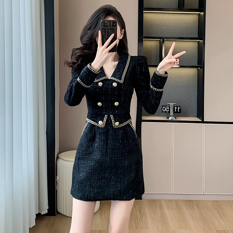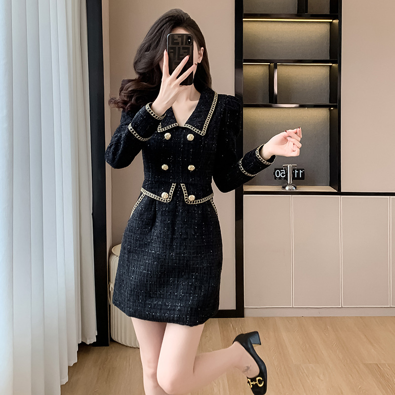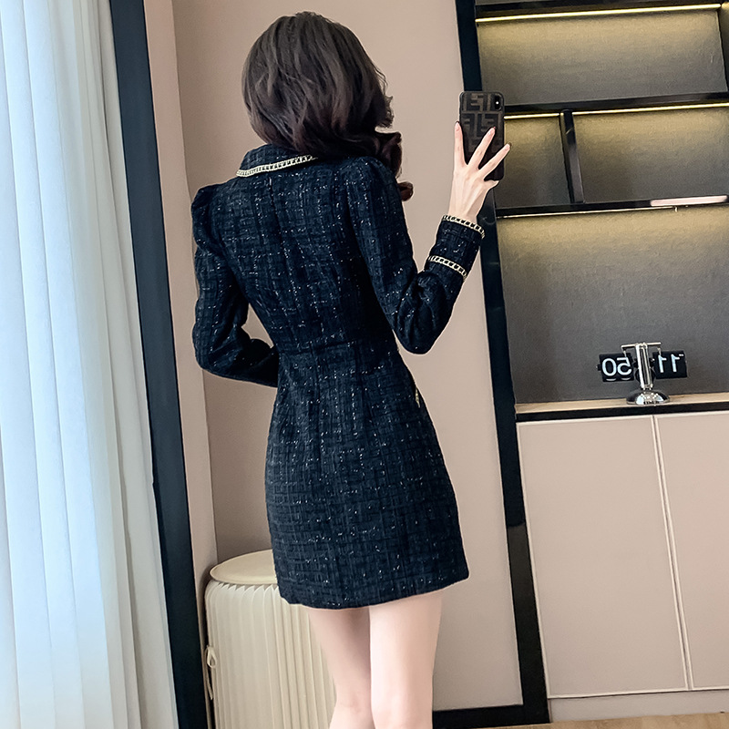 ブラックの上質なツイード素材を使用したミニ丈ワンピース。