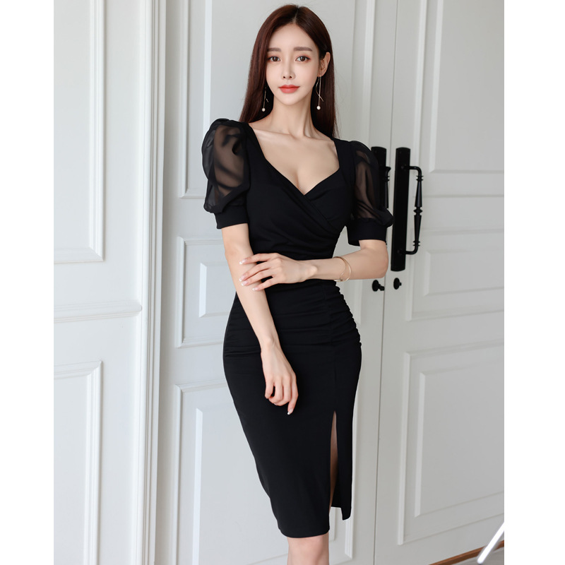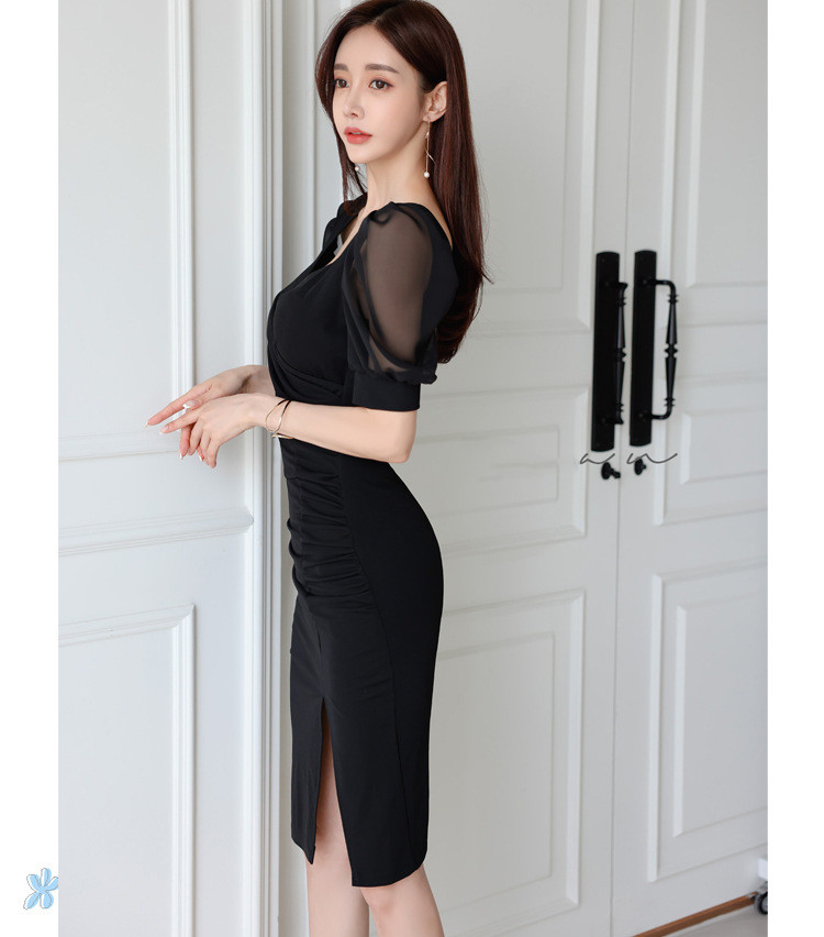 透け感のある袖とスリットが上品な色気を演出します。