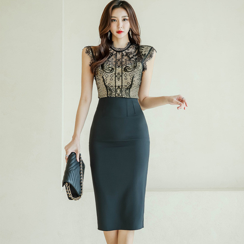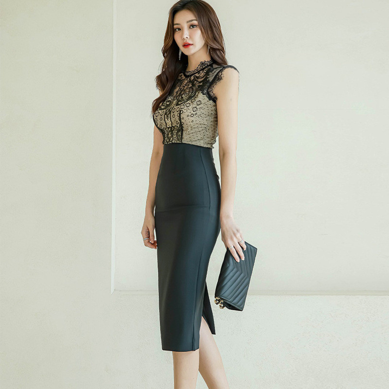 上品なレース切り替えとスリット入りデザインが魅力的なフォーマルドレスです。