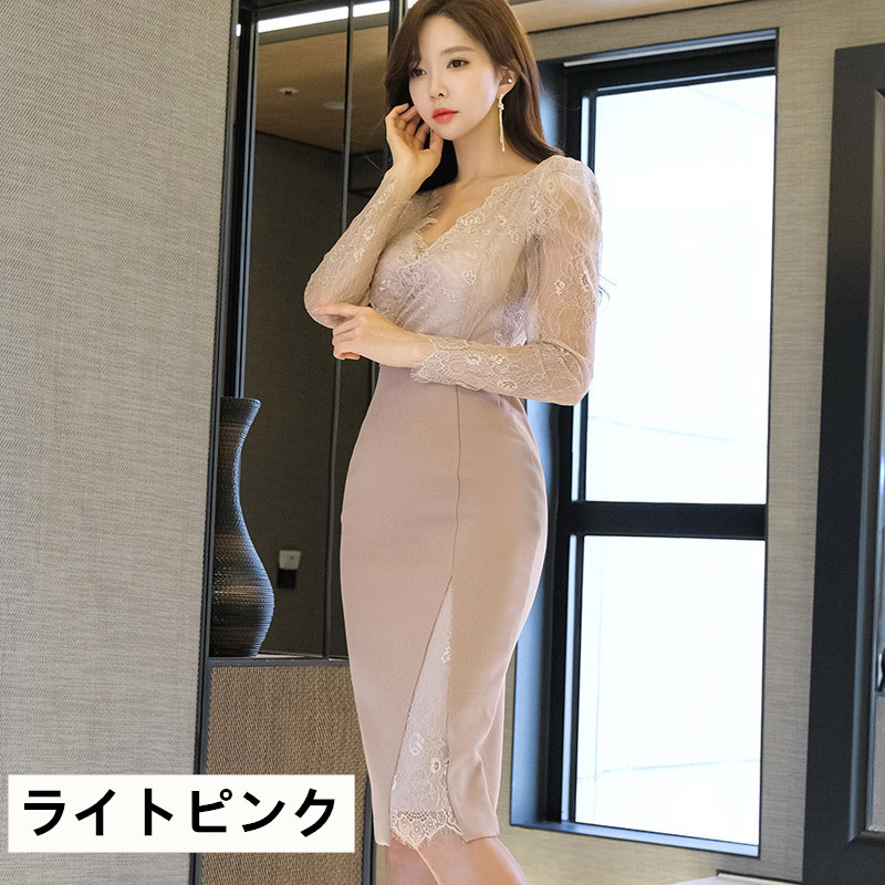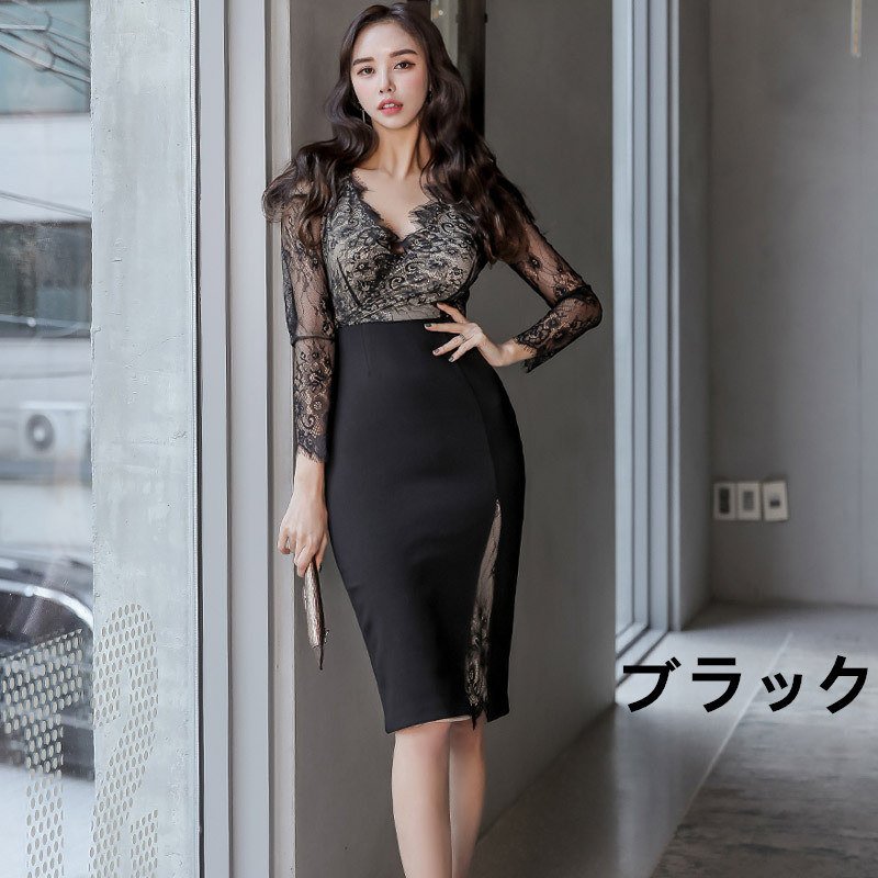 透け感のあるレース長袖と体のラインを美しく見せるタイトなシルエット。