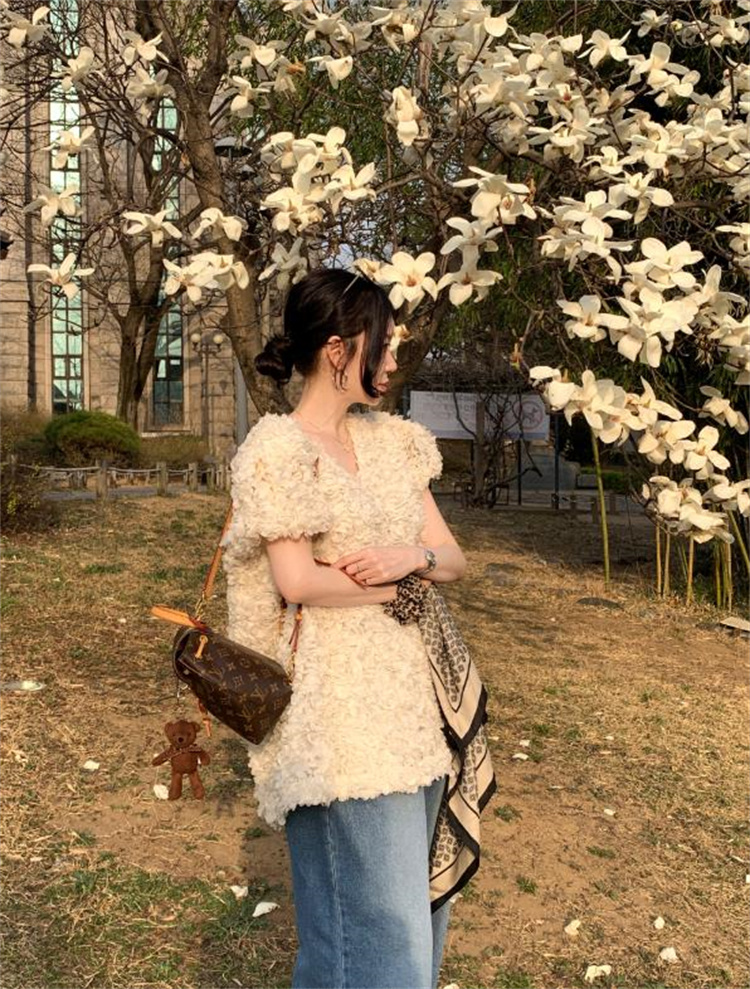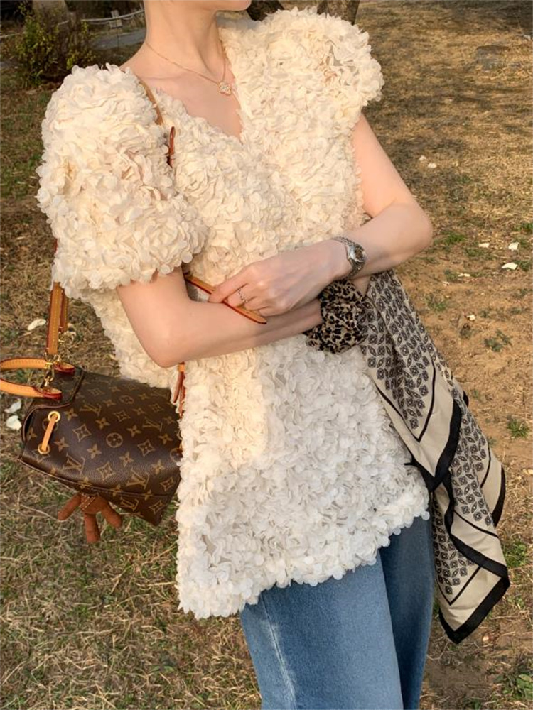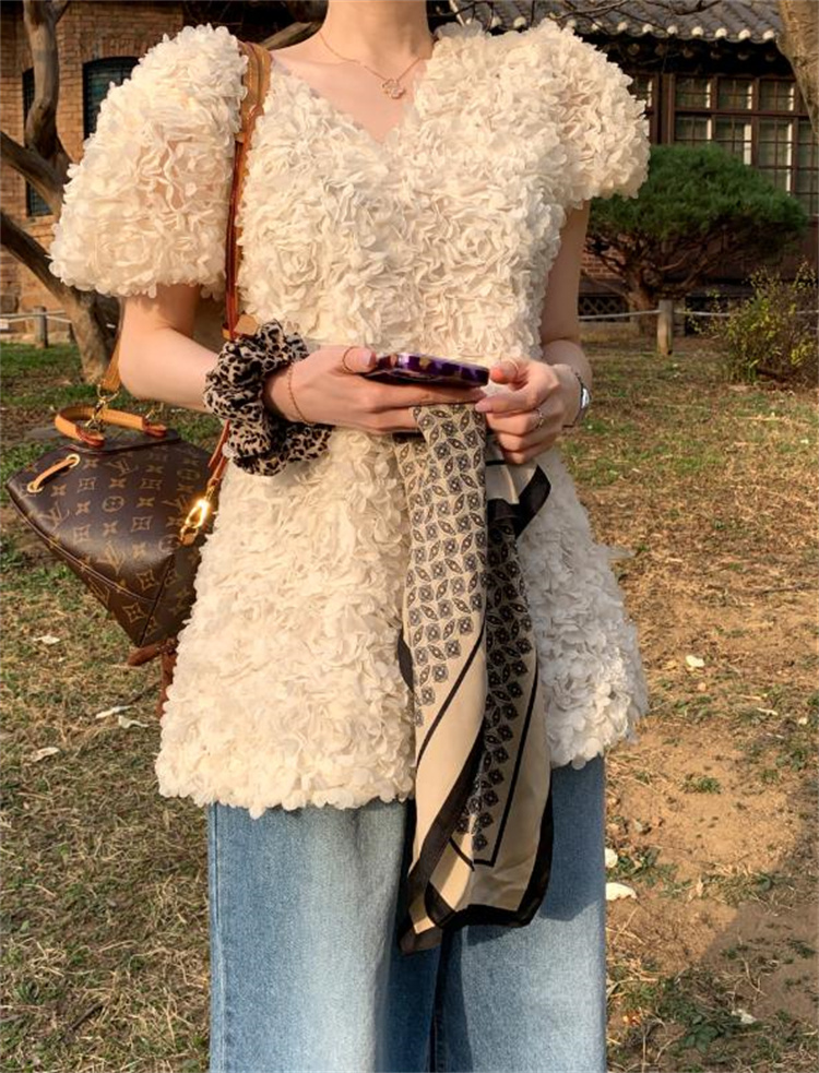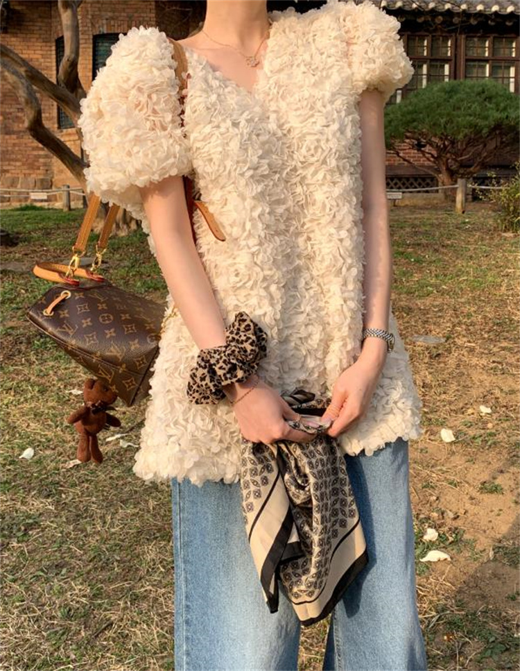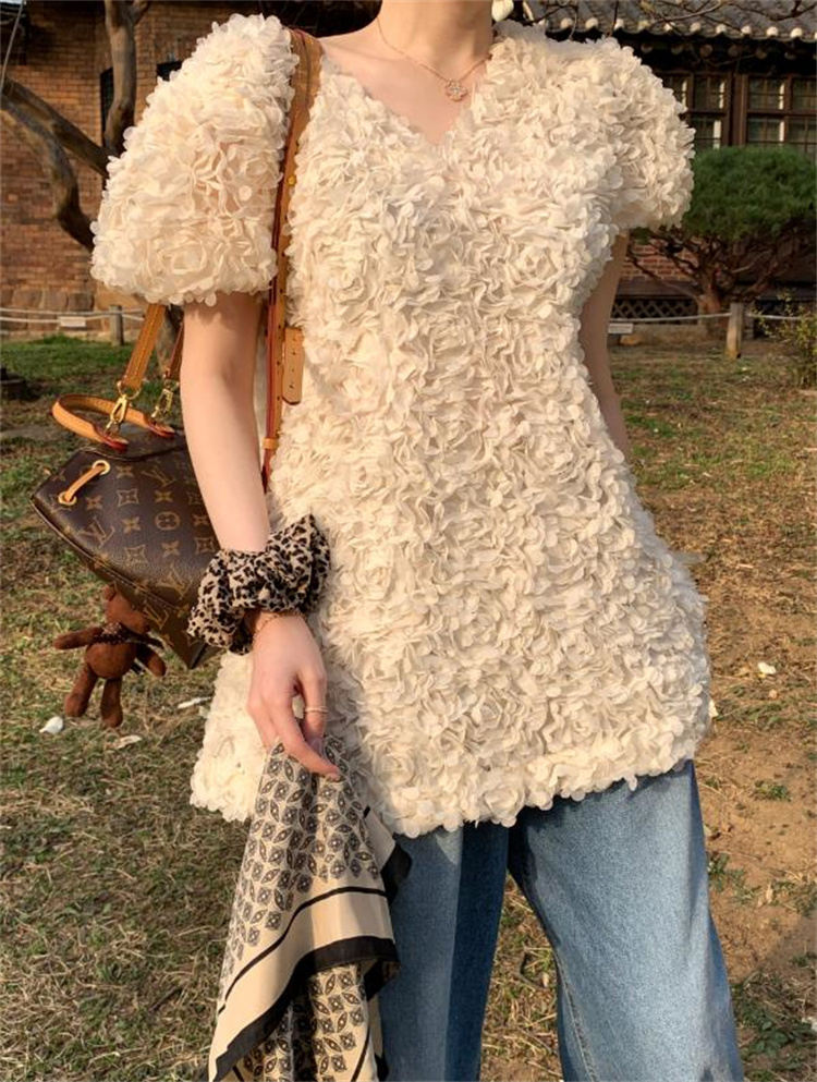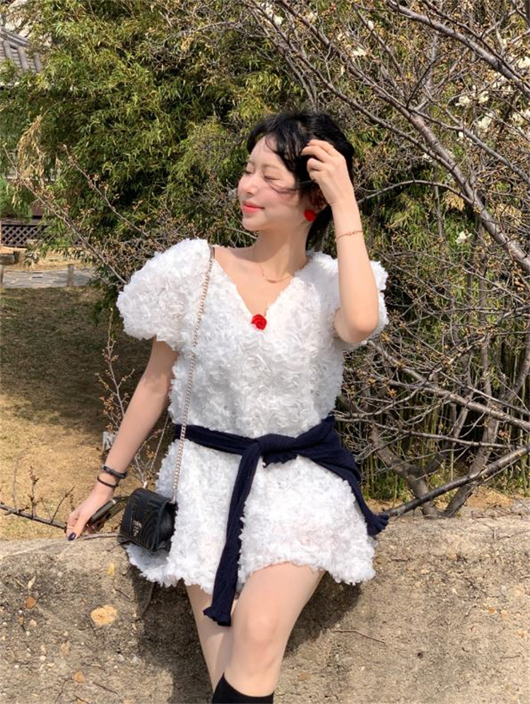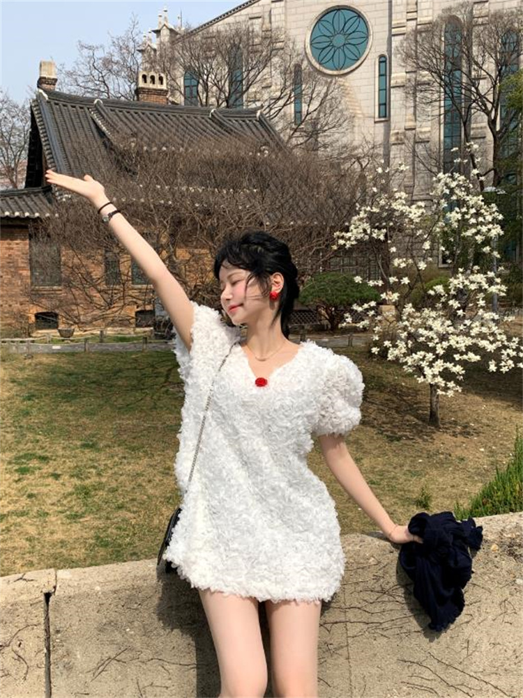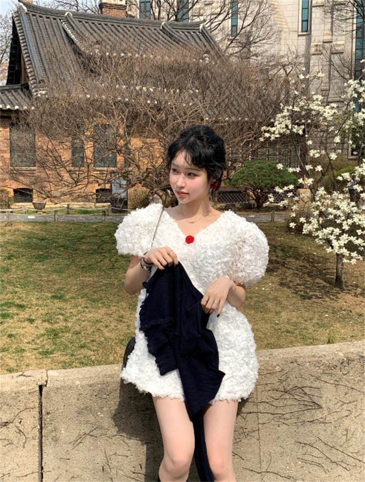 可愛らしい立体花びら風のふわもこ素材が魅力的なパフ袖ミニワンピース。