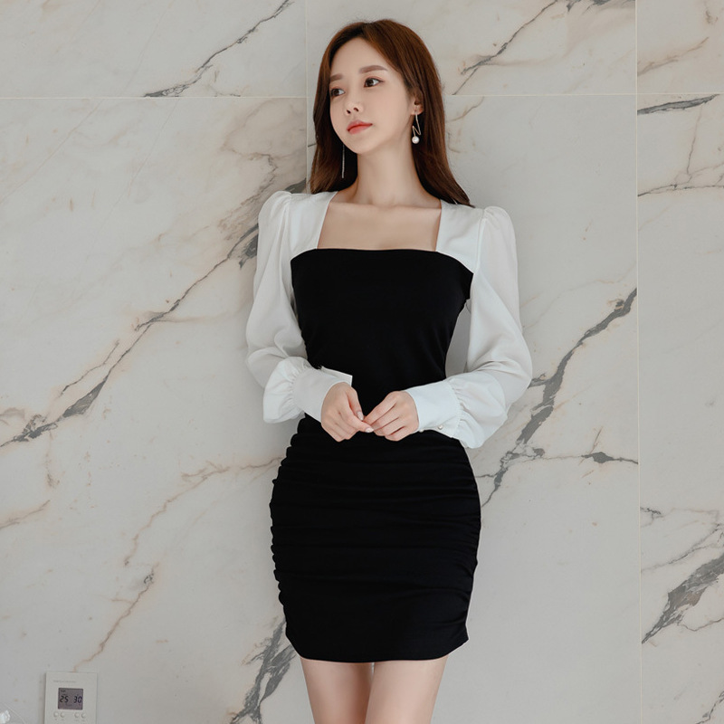 白と黒の絶妙な配色でシックな印象を与える、ロングワンピース専門店がお届けする特別な一着。