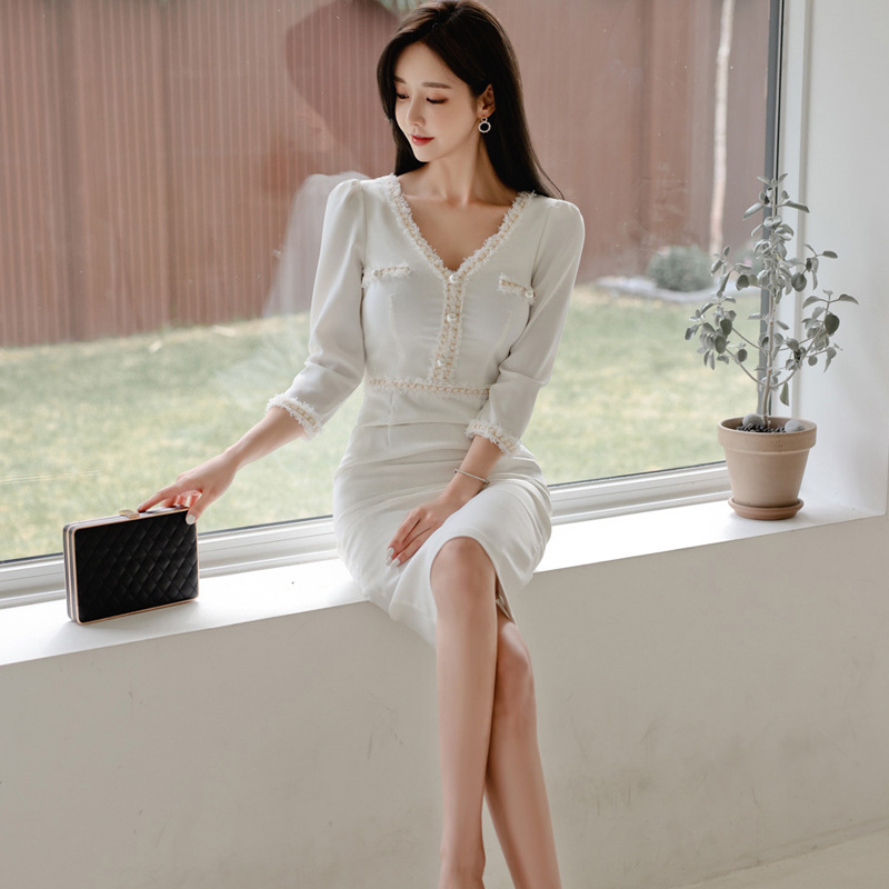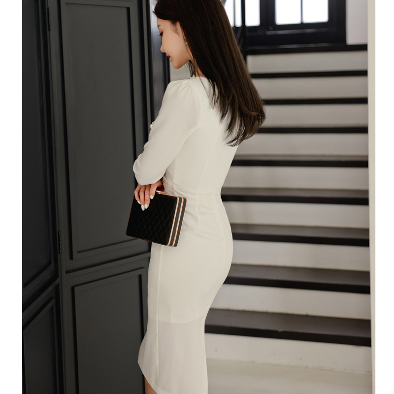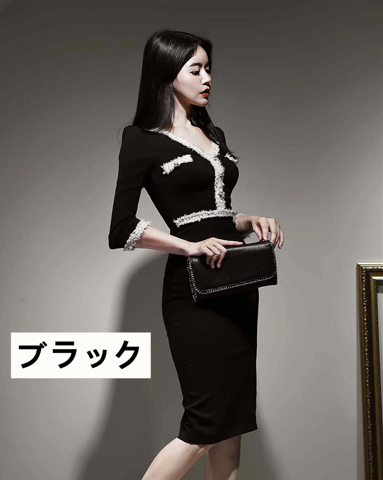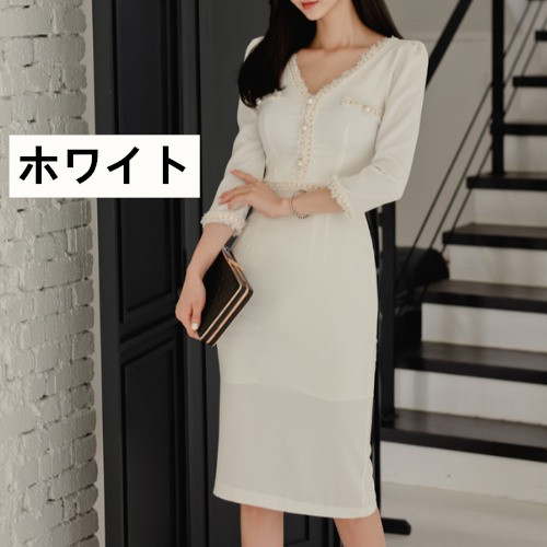 フォーマルからカジュアルまで幅広いシーンで活躍する膝丈ドレスです。