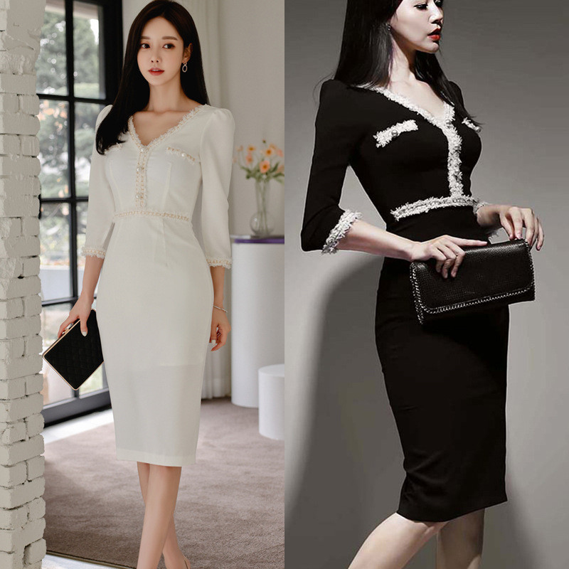 繊細なレースが美しいブイネックデザインで、上品な印象を演出。