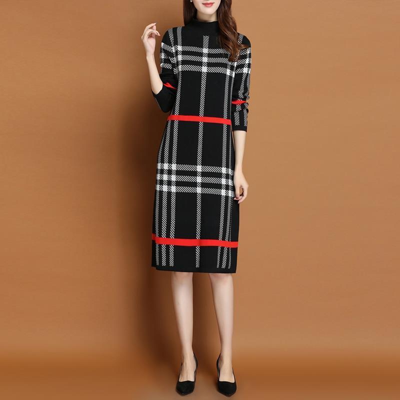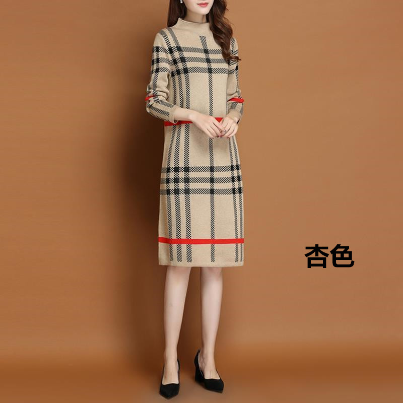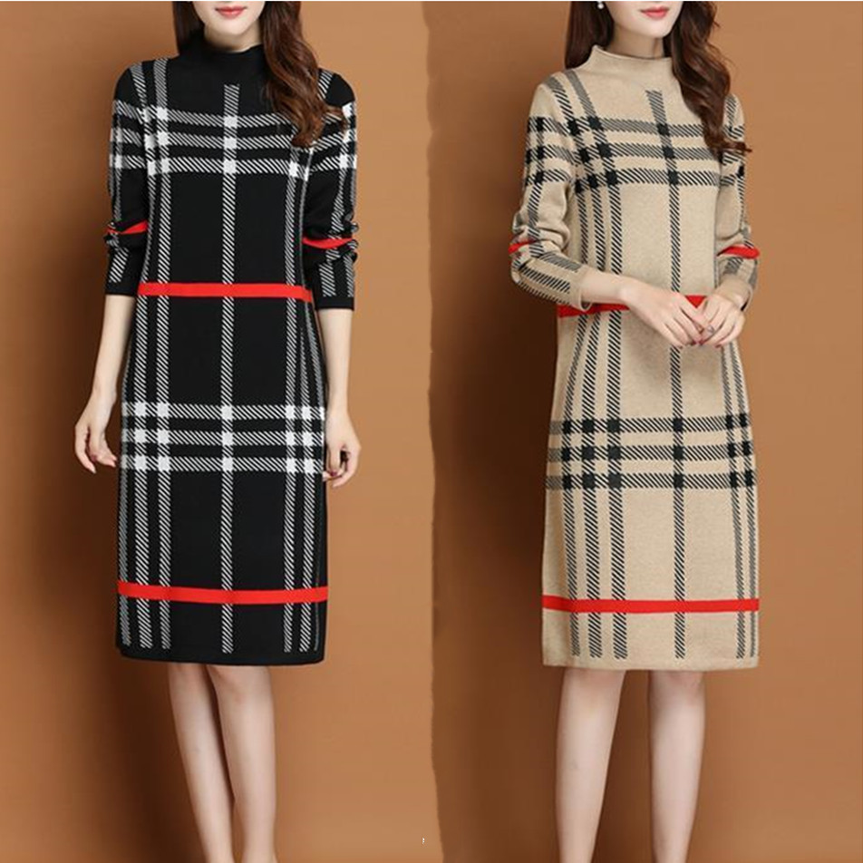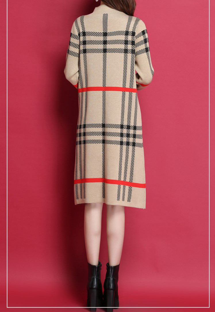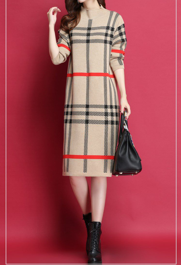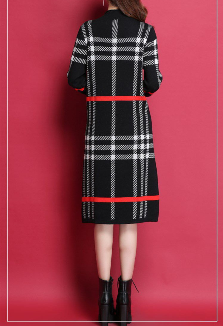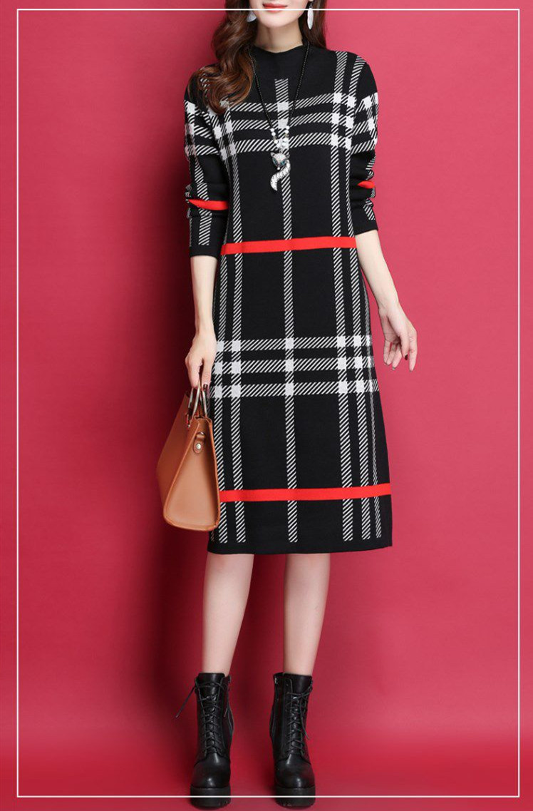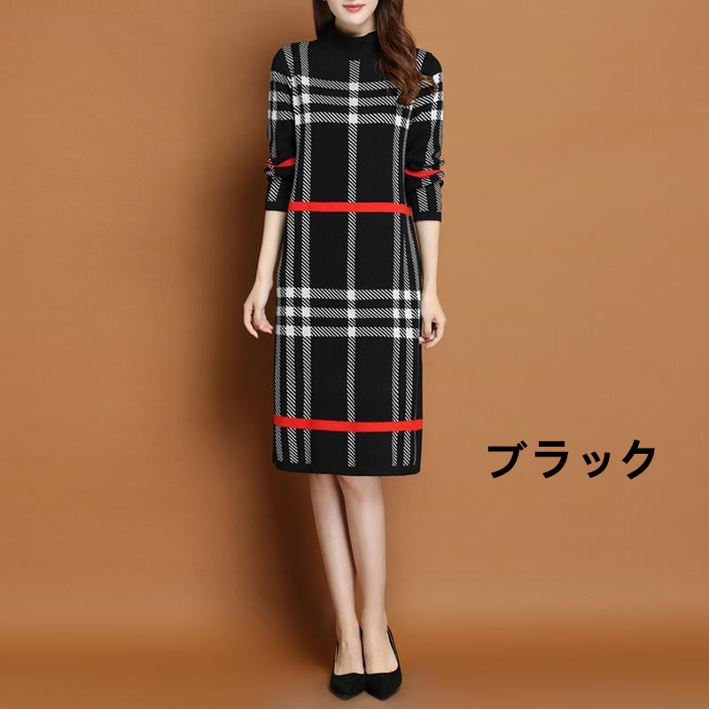 赤いライン入りのおしゃれなチェック柄ニットロングワンピースです。