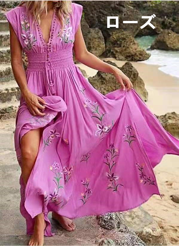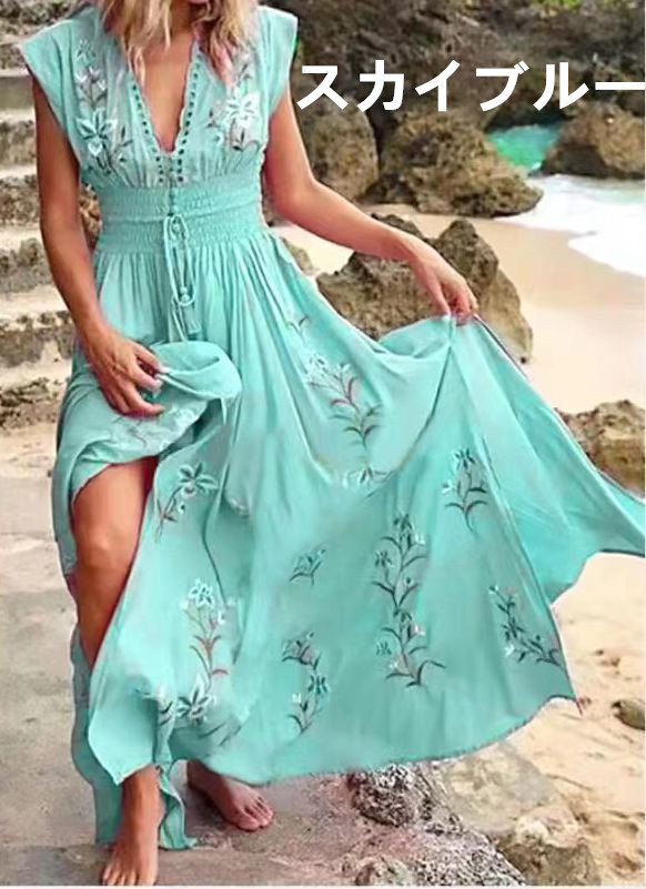 上品な刺繍デザインで大人っぽい装いを演出し、裾に向かって広がるマキシ丈のゆったりとしたシルエットが女性らしさを引き立てます。