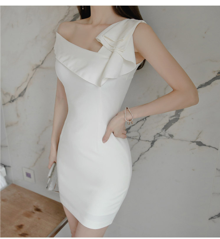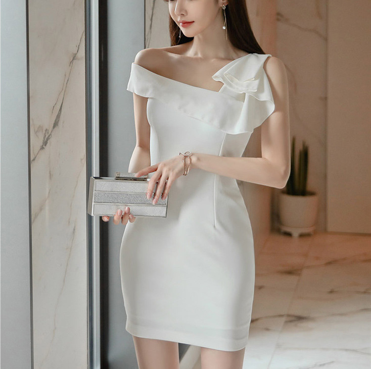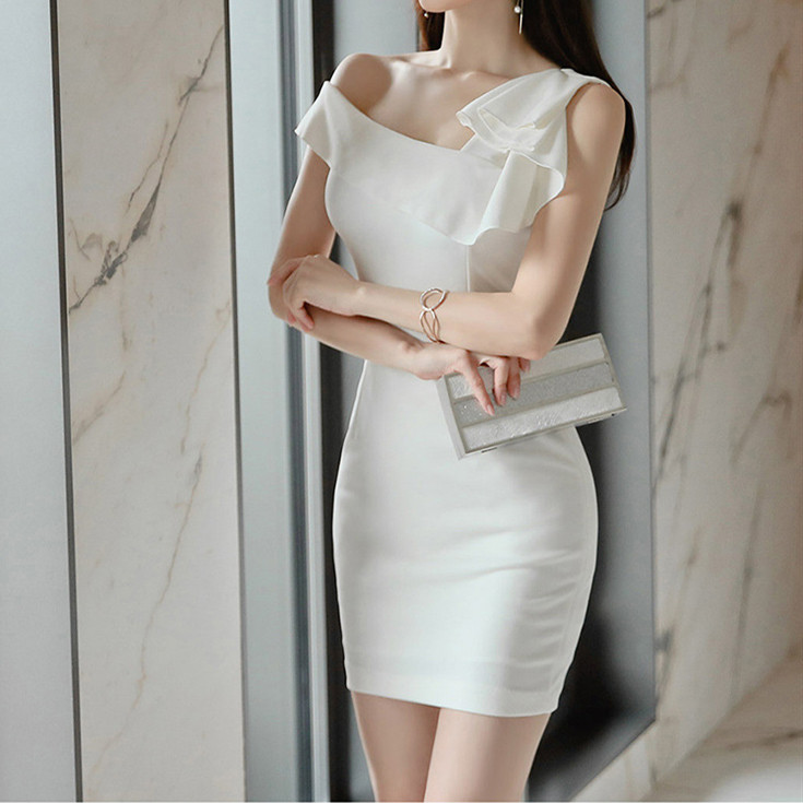エレガントなオフショルダーデザインが美しいタイトワンピース。