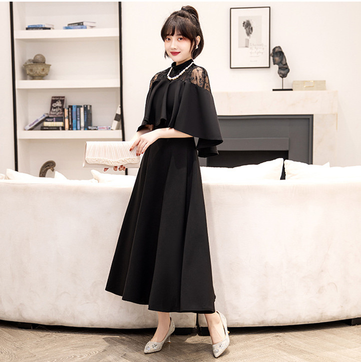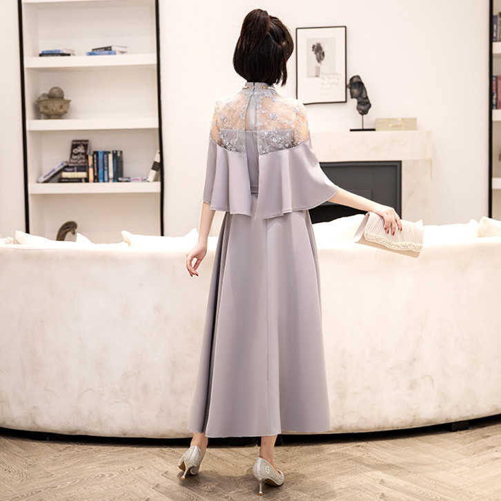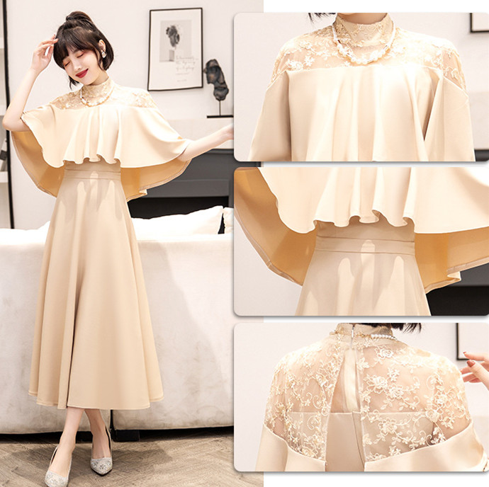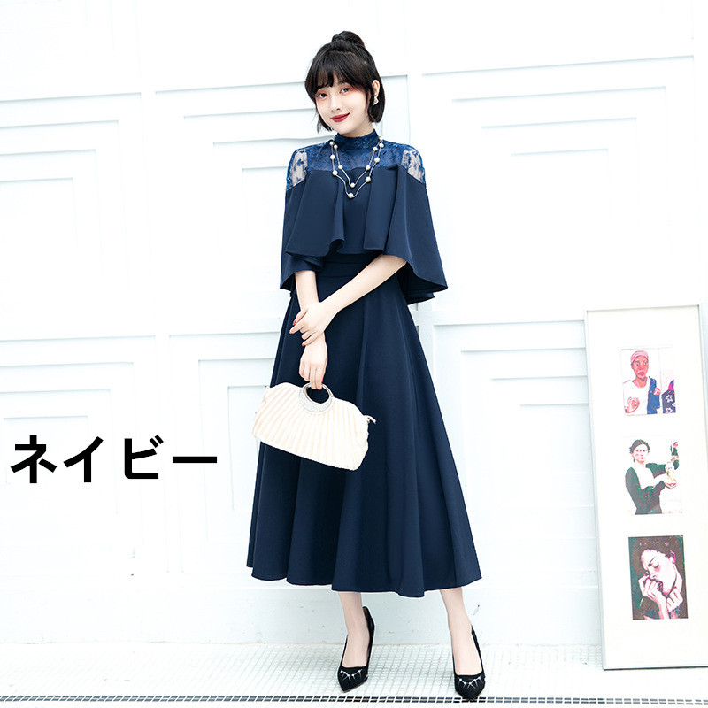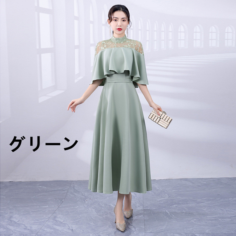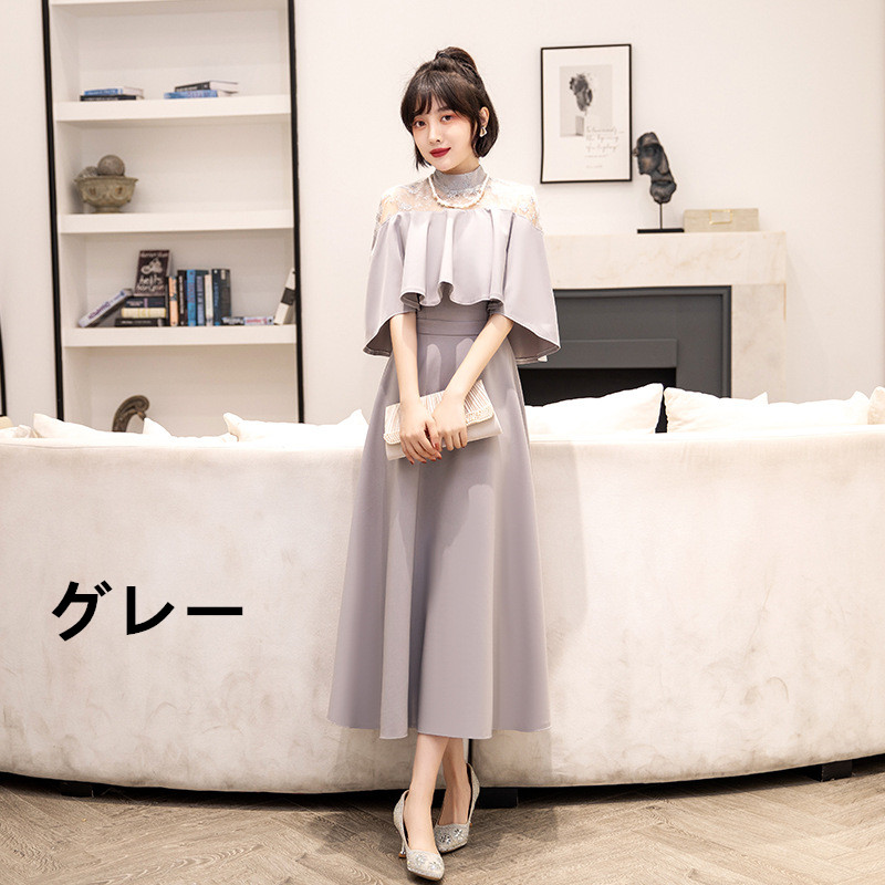 繊細なレースとエレガントなケープデザインが美しいシルエットを演出。