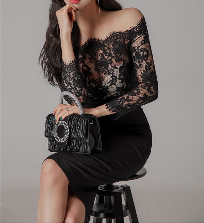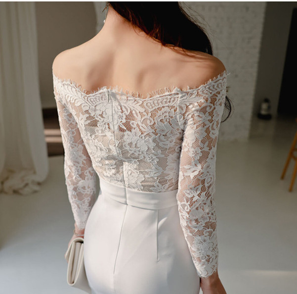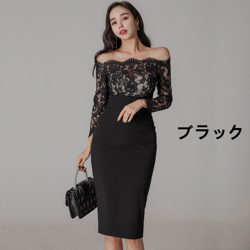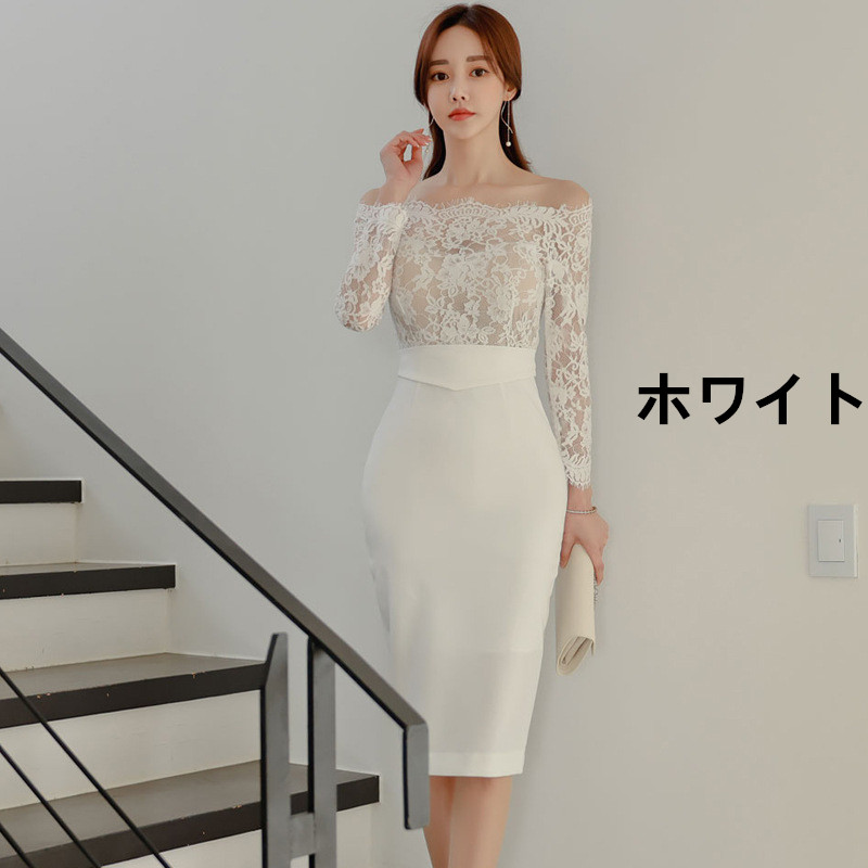 レースの透け感が美しいオフショルダーが上品な色気を演出する、フォーマルドレスです。