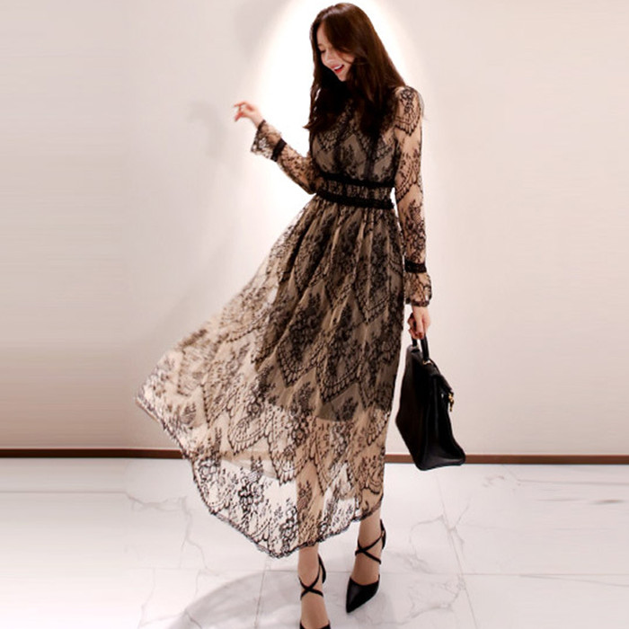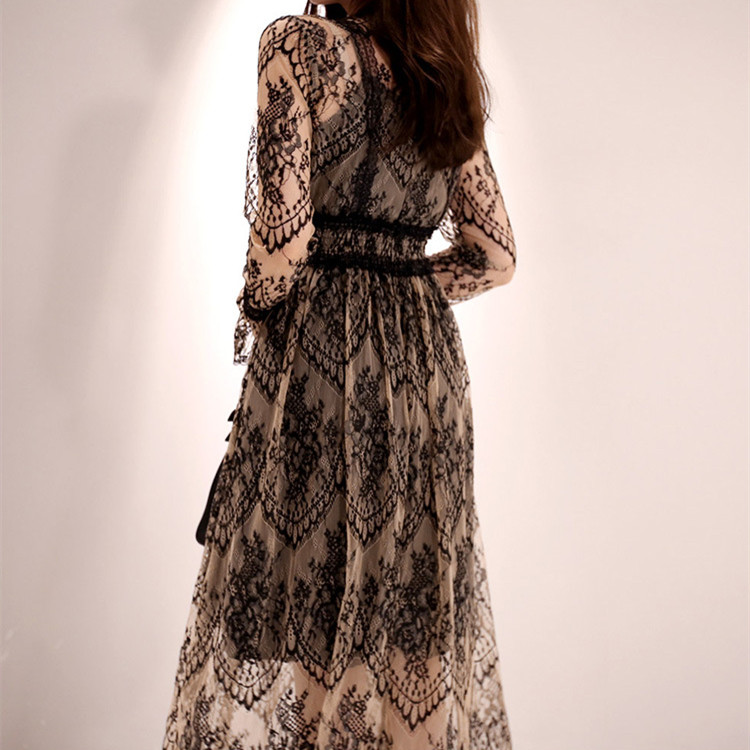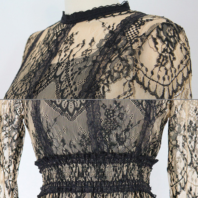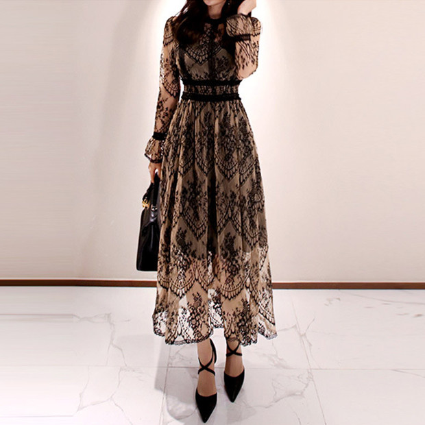 繊細な総レースデザインが上品な印象を与える、結婚式などフォーマルシーンに最適なドレスです。