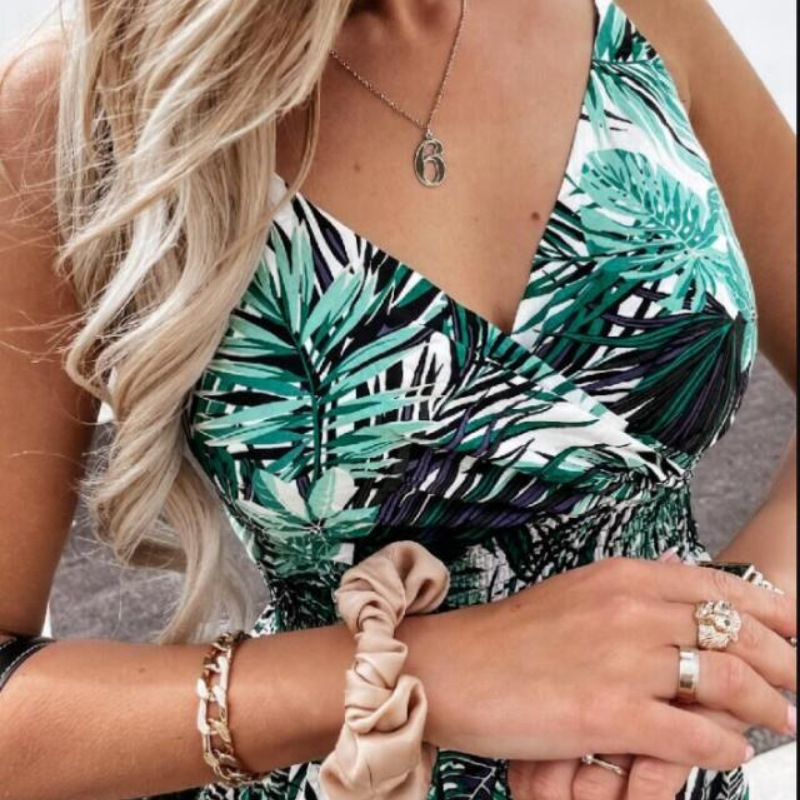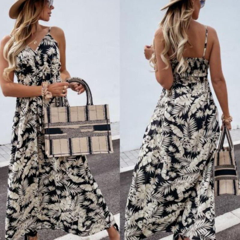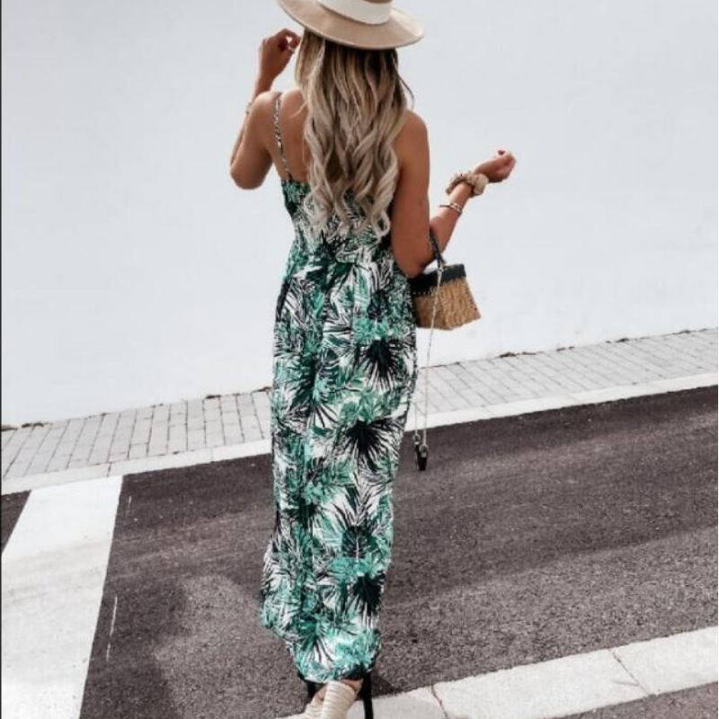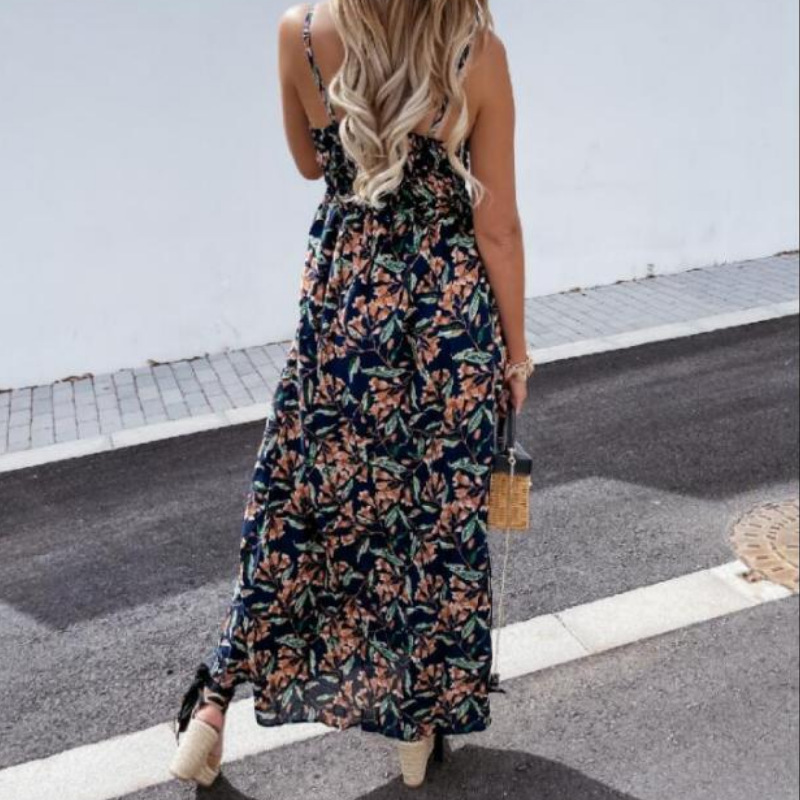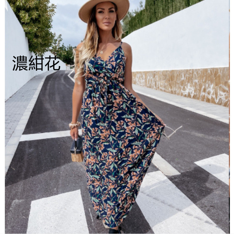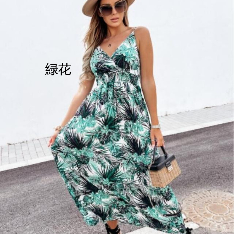夏のリゾートシーンに映える花柄ロングワンピースです。