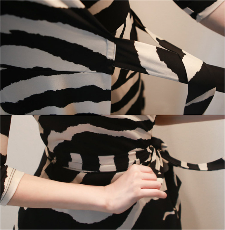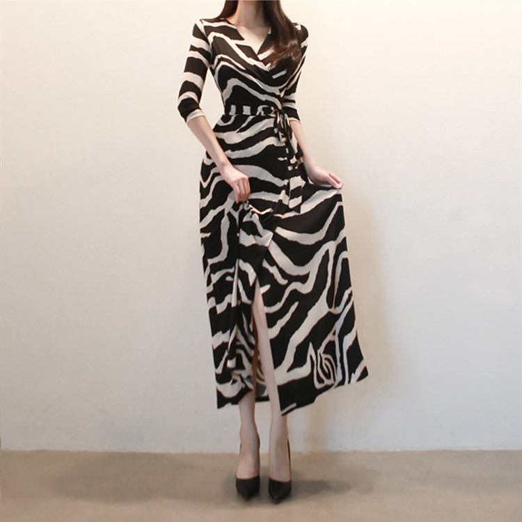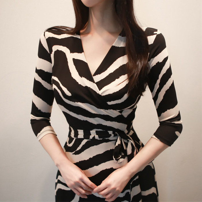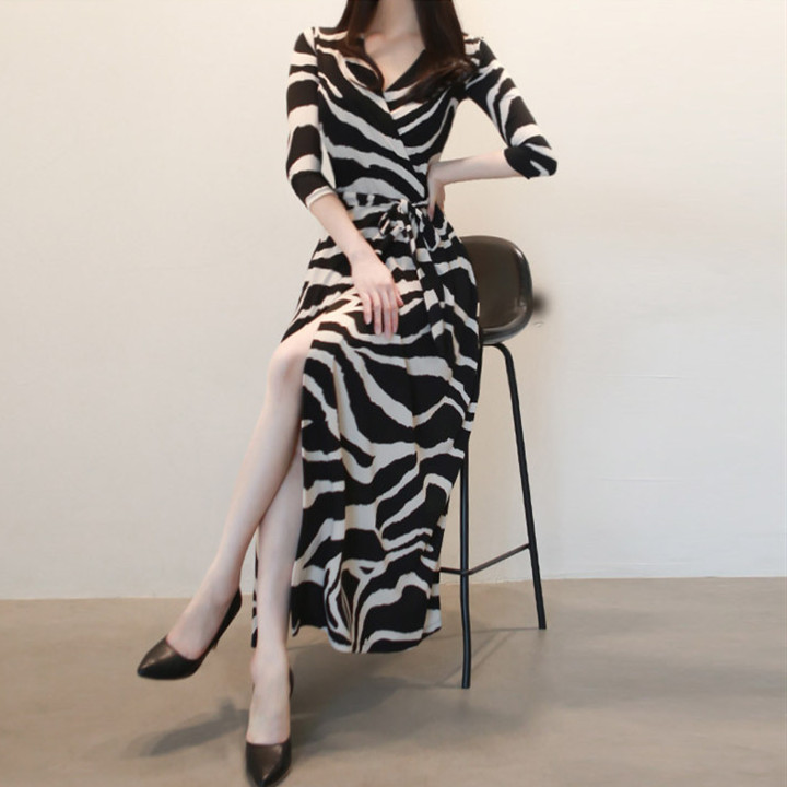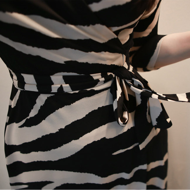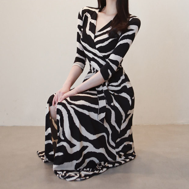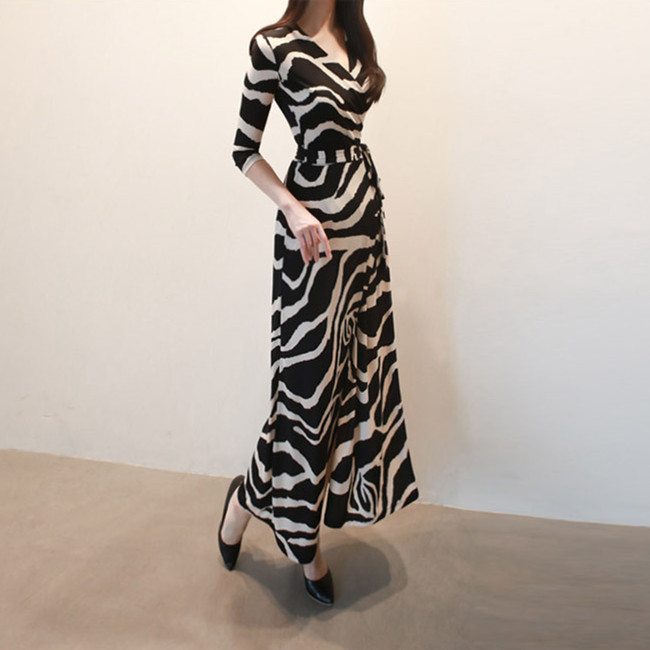 印象的なゼブラ柄とマキシ丈が洗練された雰囲気を演出し、カシュクールデザインでスタイルアップ効果も抜群。
