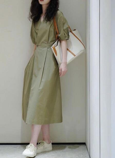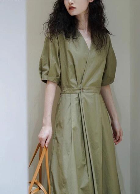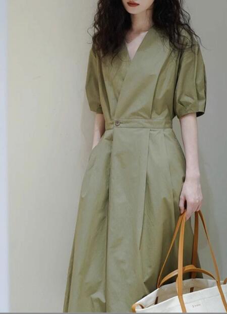 今季注目のオリーブグリーンが美しいシャツタイプのロングワンピース。