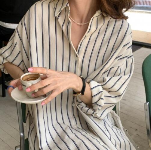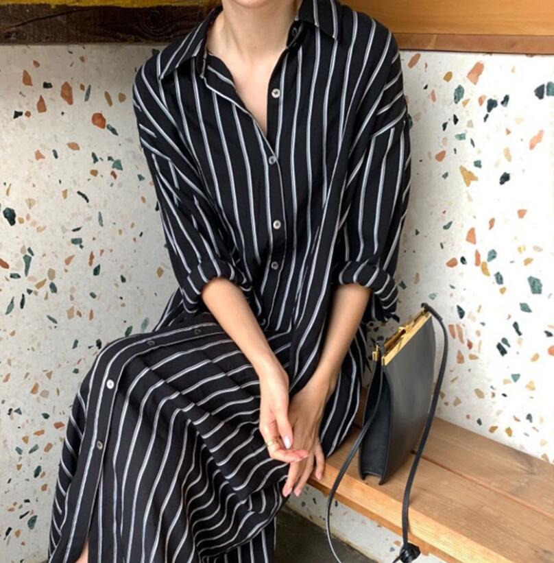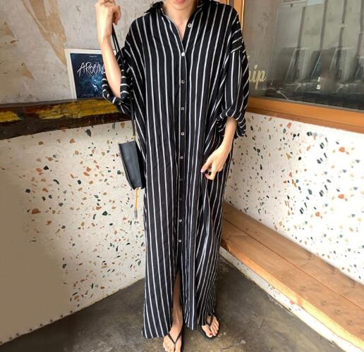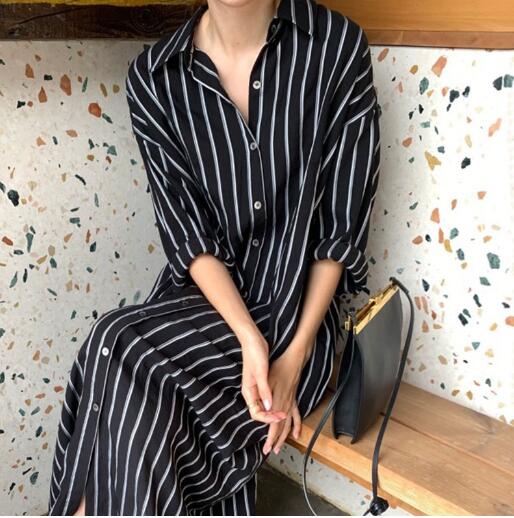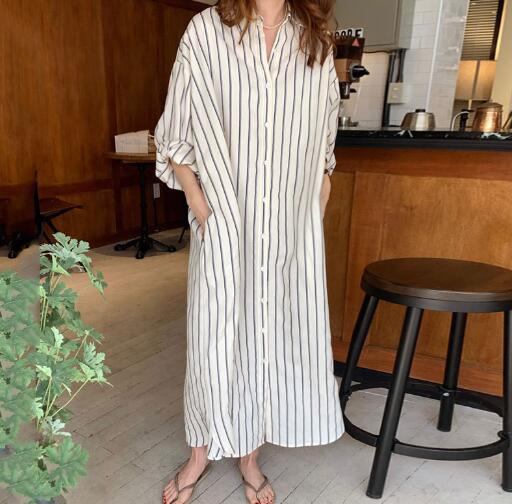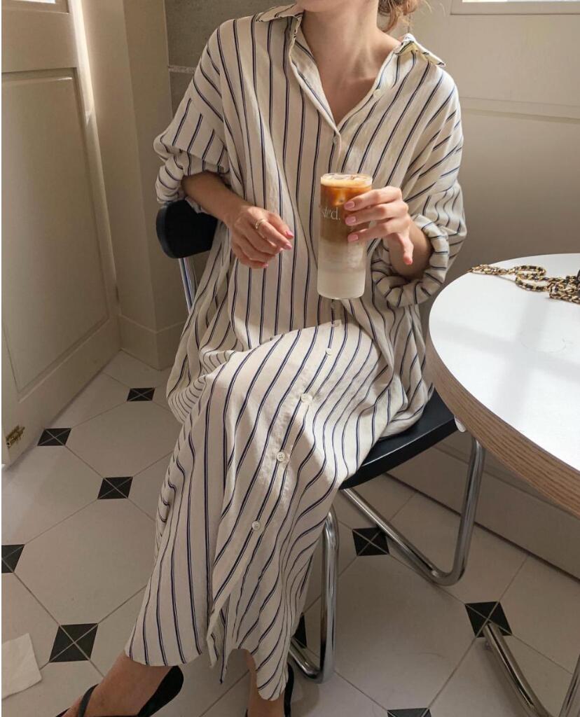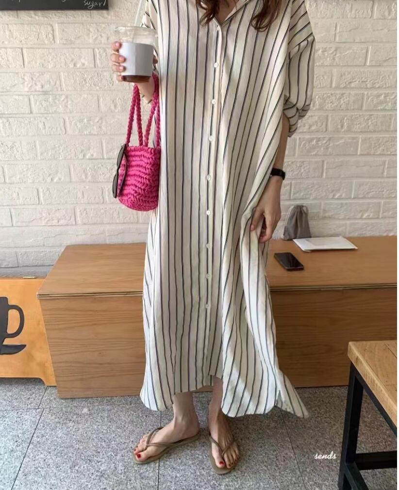 2025年春の新作、縦縞柄が上品な印象を与えるシャツタイプのロングワンピースです。