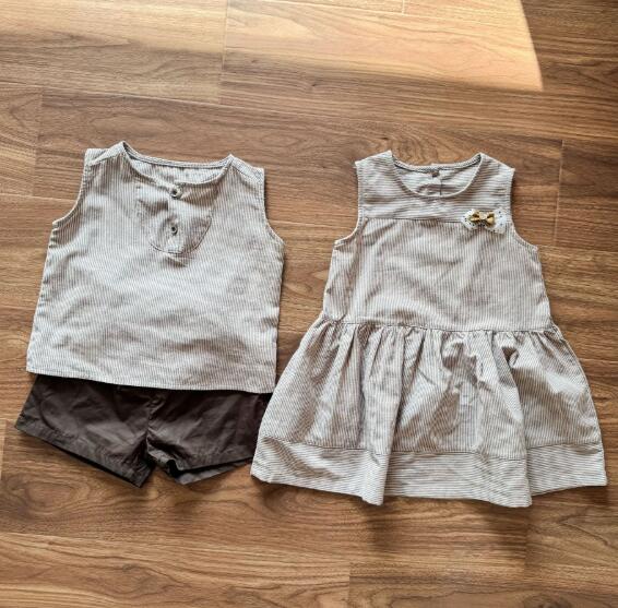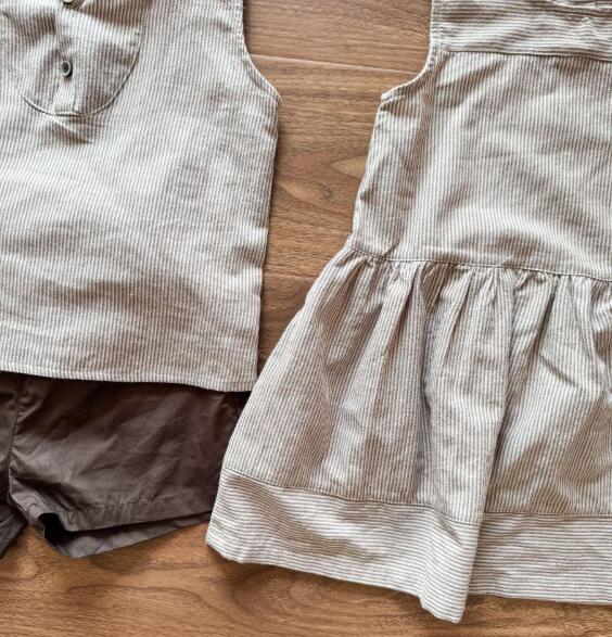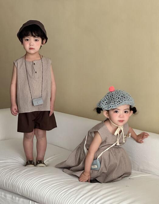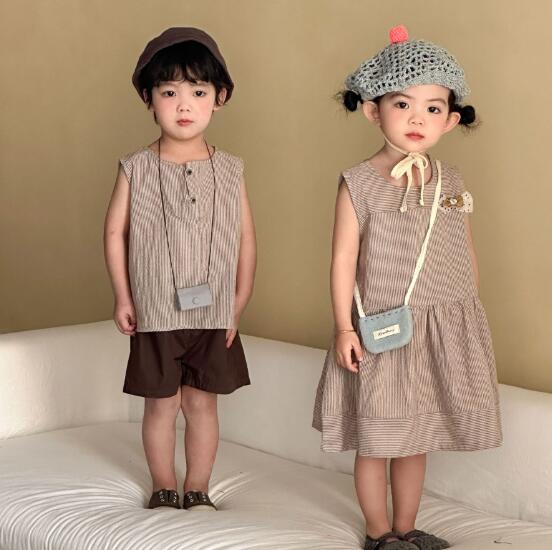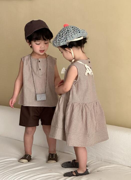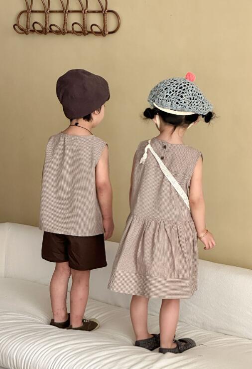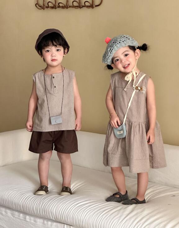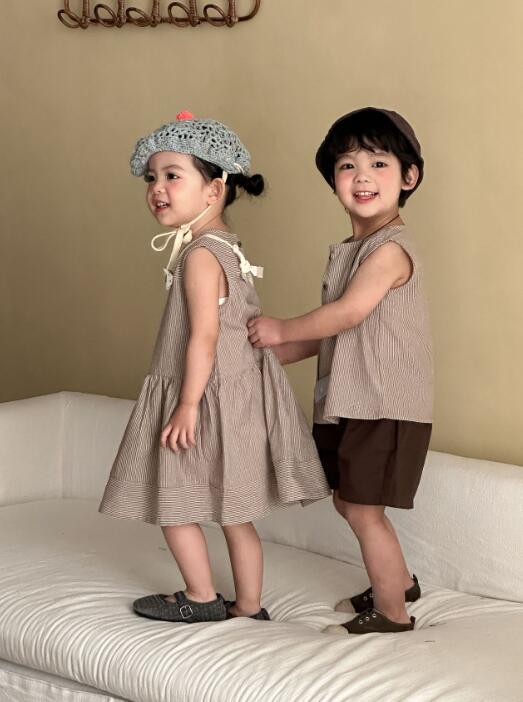キッズ向けの可愛らしい姉妹兄弟お揃いコーディネートセット。 男の子用はベスト風トップスとハーフパンツ、女の子用はロングワンピース仕様で上品な仕上がり。 ストライプ柄が爽やかで夏のお出かけにぴったり。 姉妹兄弟でお揃いを楽しめる特別なセットアップです。