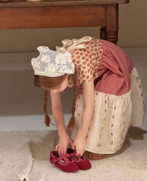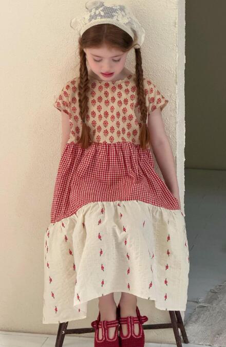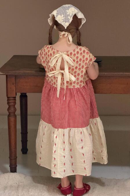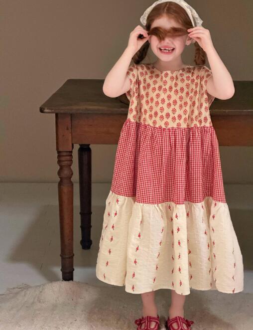 花柄とギンガムチェックを組み合わせたティアードデザインで、おしゃれで可愛らしい一着。