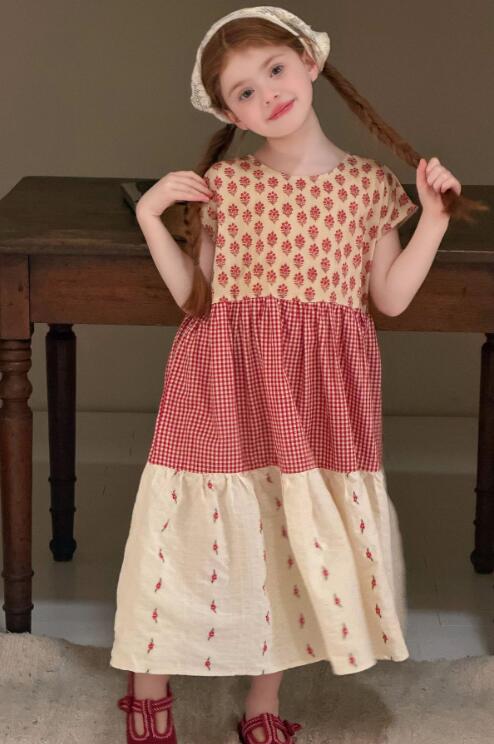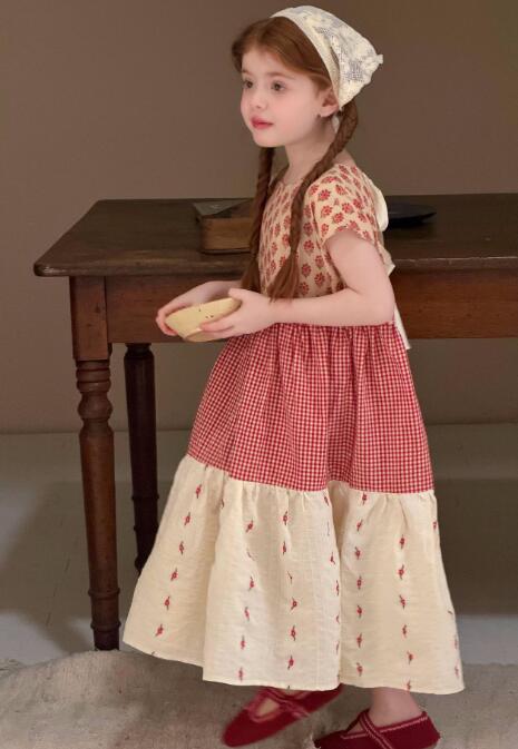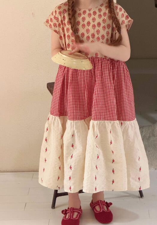 女の子に人気のキッズ用ロングワンピースです。 花柄とギンガムチェックを組み合わせたティアードデザインで、おしゃれで可愛らしい一着。 90センチから150センチまで幅広いサイズ展開で、お出かけや特別な日にぴったりです。