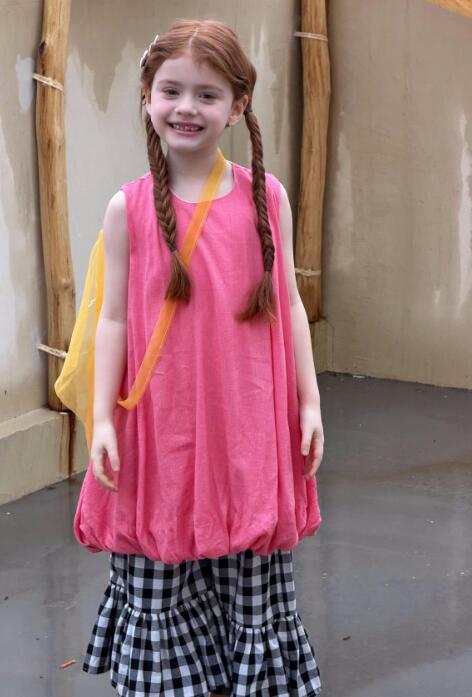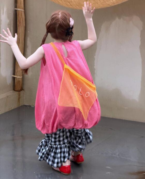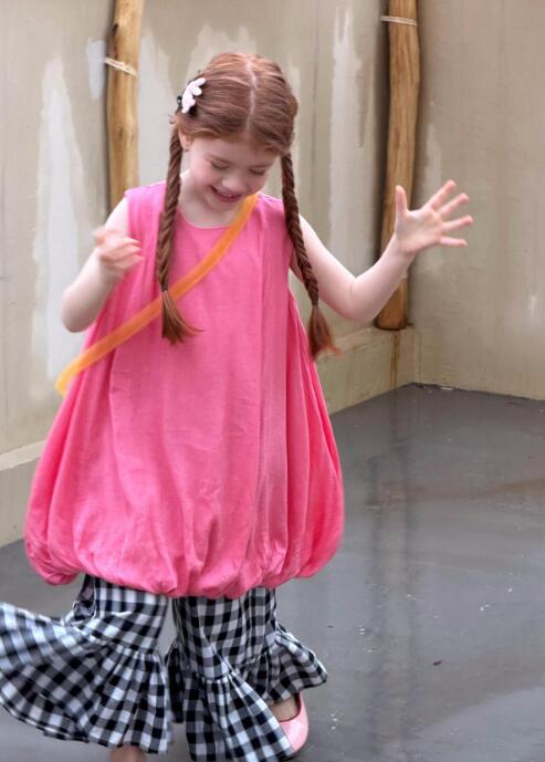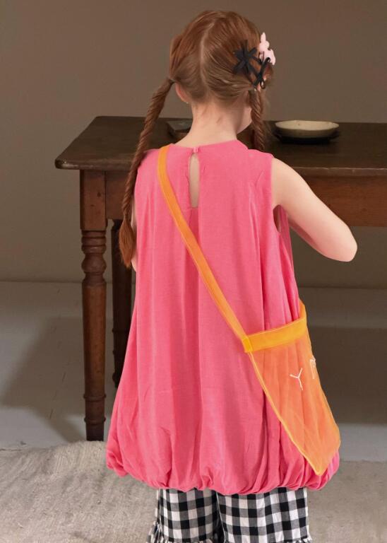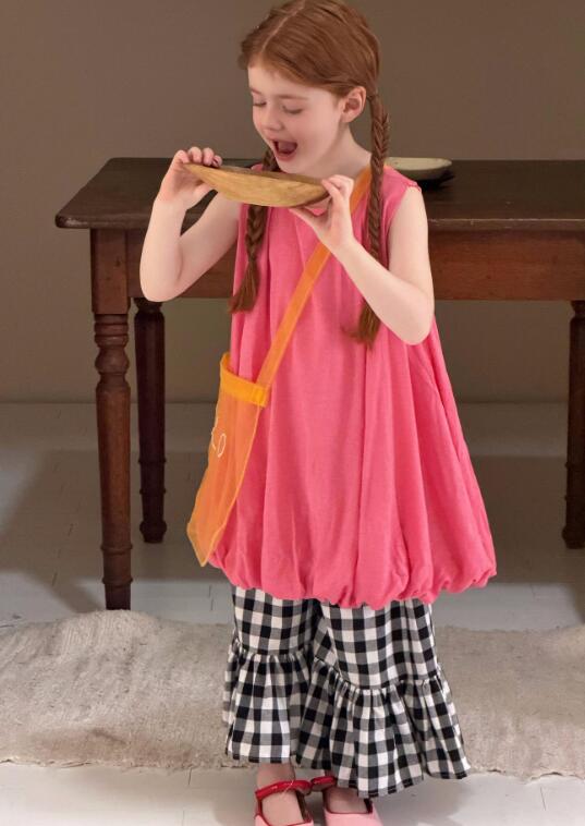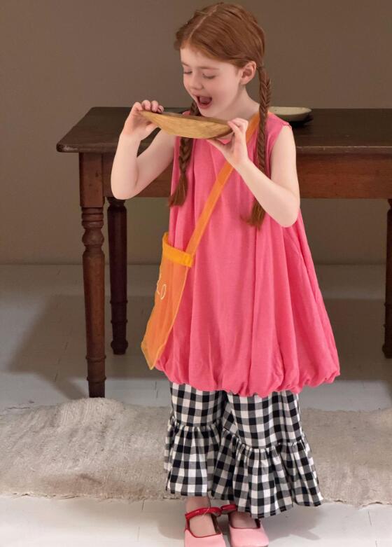 可愛いピンクのベストと格子柄スカートが一体になったキッズ用ロングワンピース。