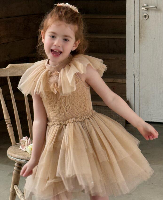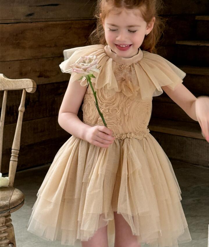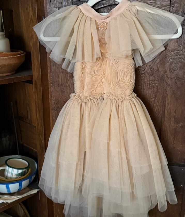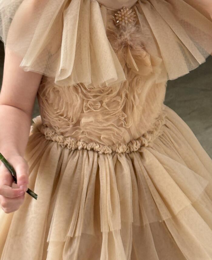 繊細なチュール襟とバラの刺繍が施された胸元が特徴的で、