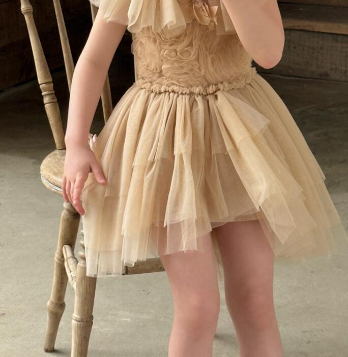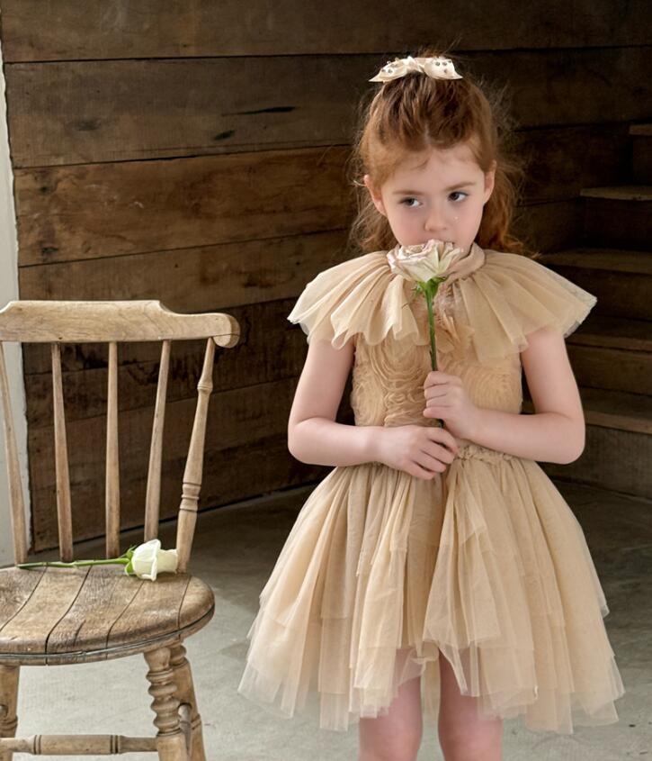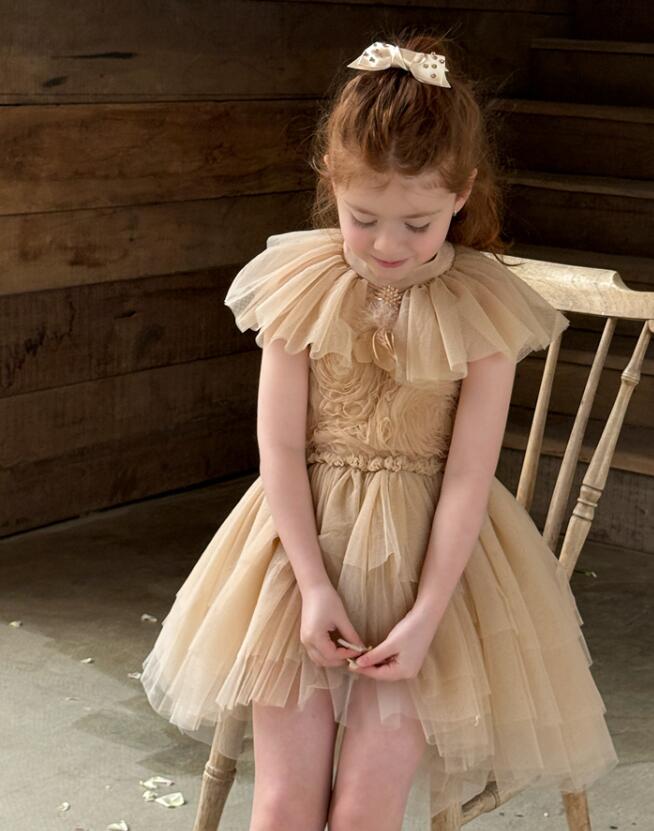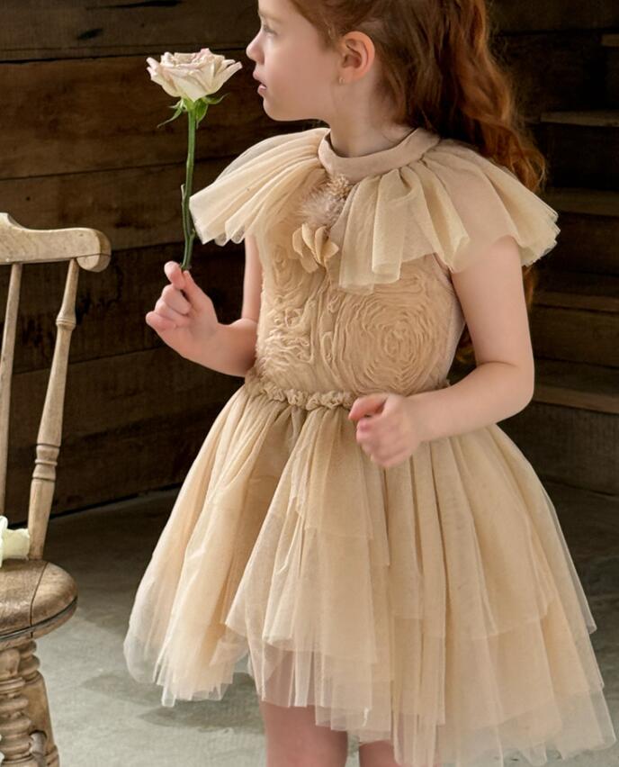 上品なベージュカラーが美しいキッズ用ロングワンピースです。