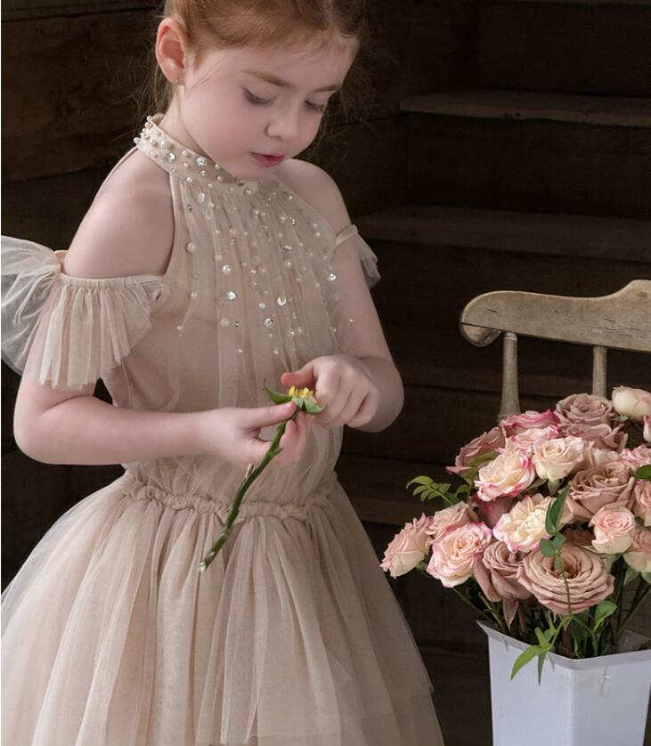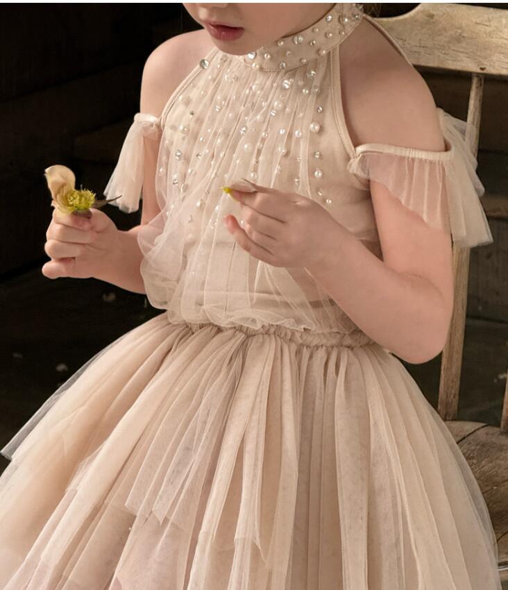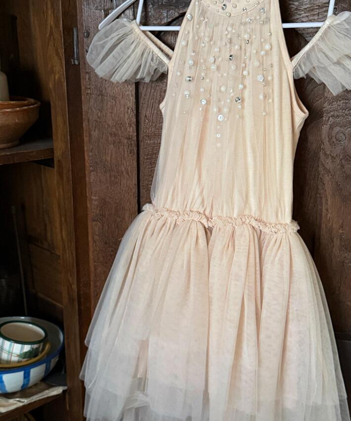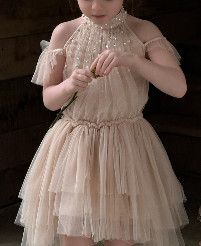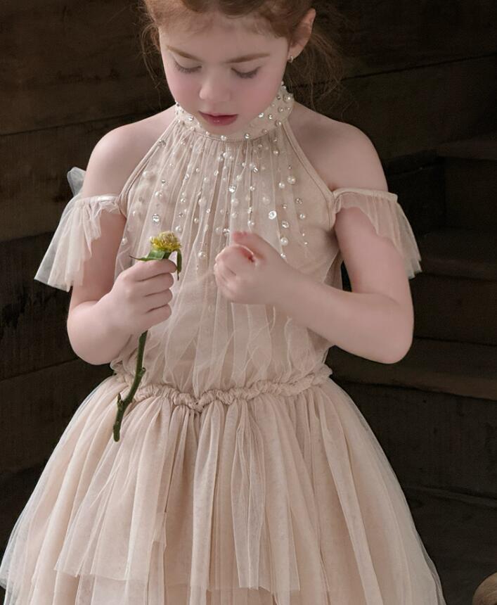 繊細なチュール素材にパール風ビーズが散りばめられた上品なデザインが魅力的。