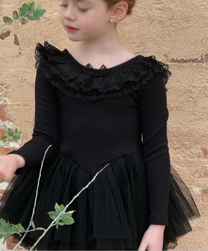 襟元の華やかなフリルデザインと、ふんわり広がるチュールスカートが特徴的。
