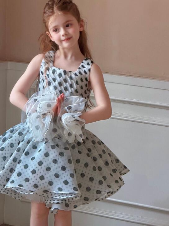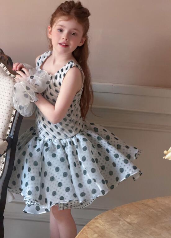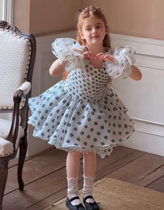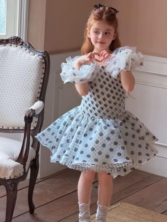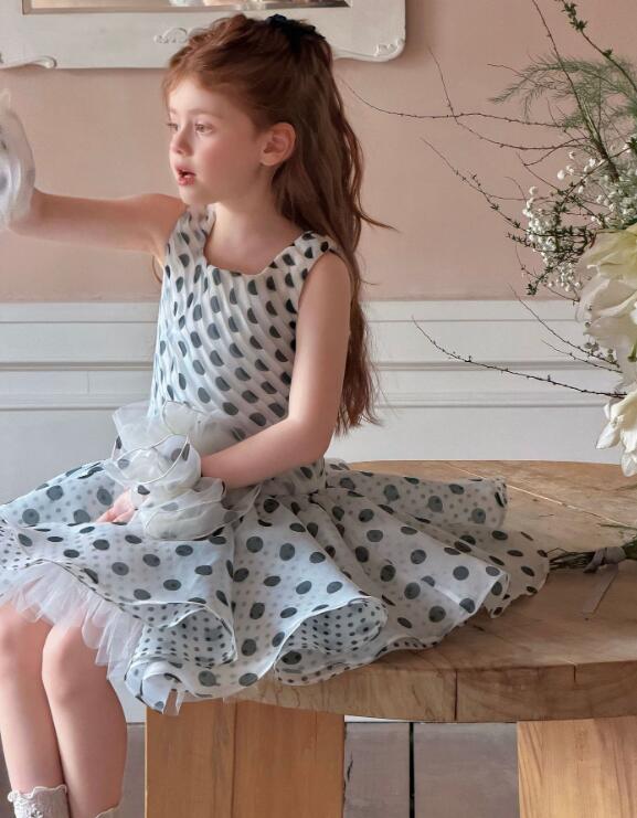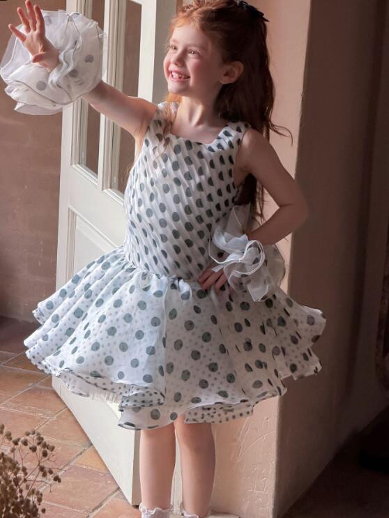 可愛らしい水玉模様が印象的なキッズ用ロングワンピースです。 上品なドット柄とふんわりとしたシルエットで、特別な日にぴったり。 お揃いのシュシュ付きで、コーディネートが完成します。 90センチから130センチまで対応で、成長に合わせてお選びいただけます。