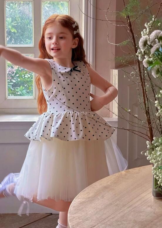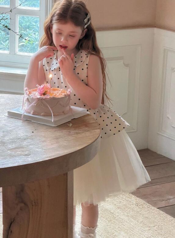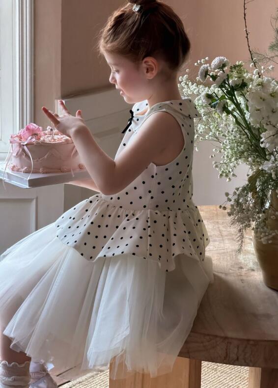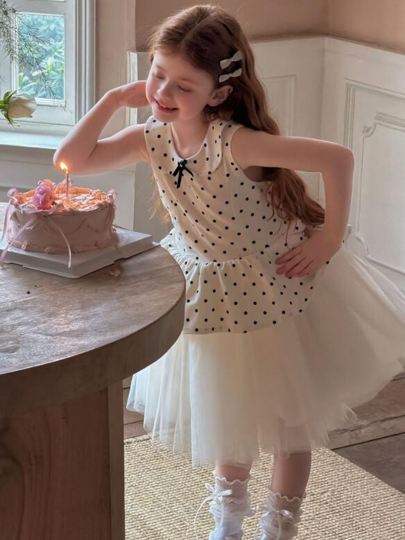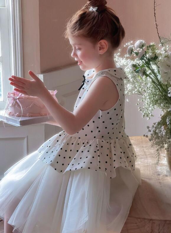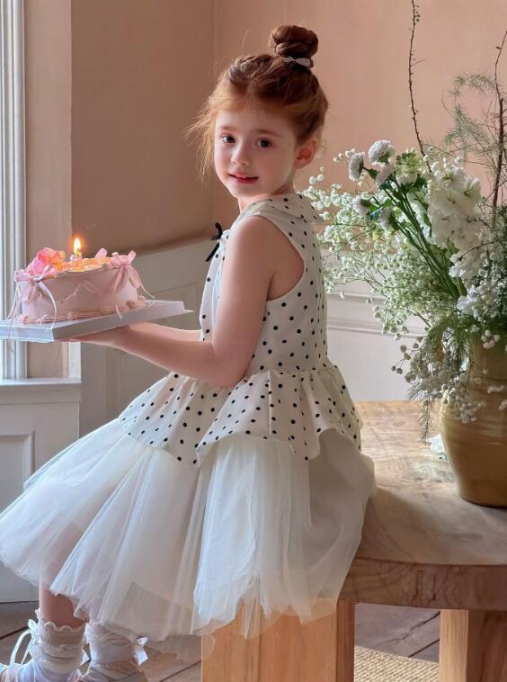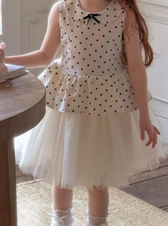 上品な水玉模様が可愛いキッズ用ロングワンピースです。 ふわりと広がるチュールスカートで特別な日にぴったり。 90センチから130センチまでサイズ展開豊富で成長に合わせて選べます。 発表会や結婚式などのフォーマルシーンにもおすすめの一着です。