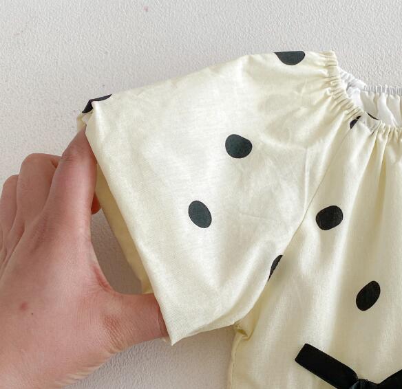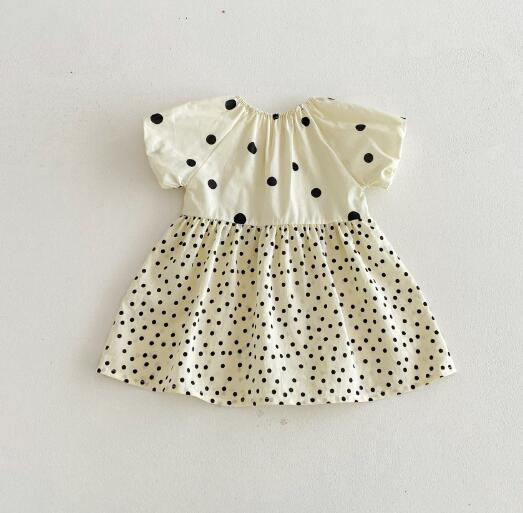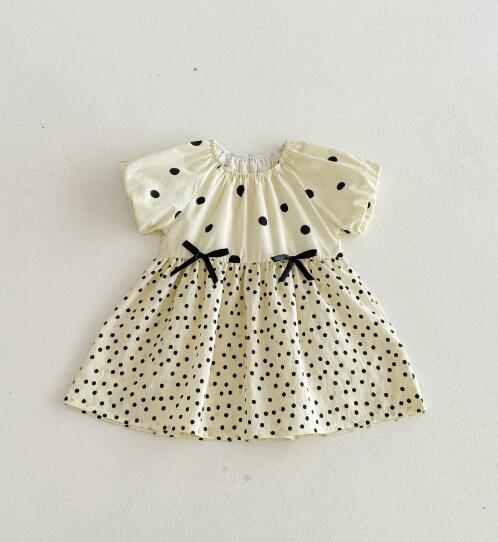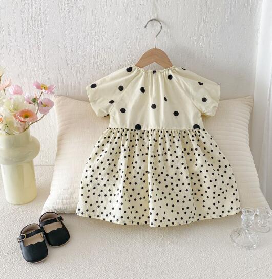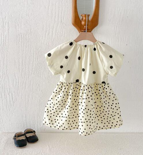 上身頃は大きなドット柄、スカート部分は細かなドット柄で切り替えたおしゃれなデザイン。