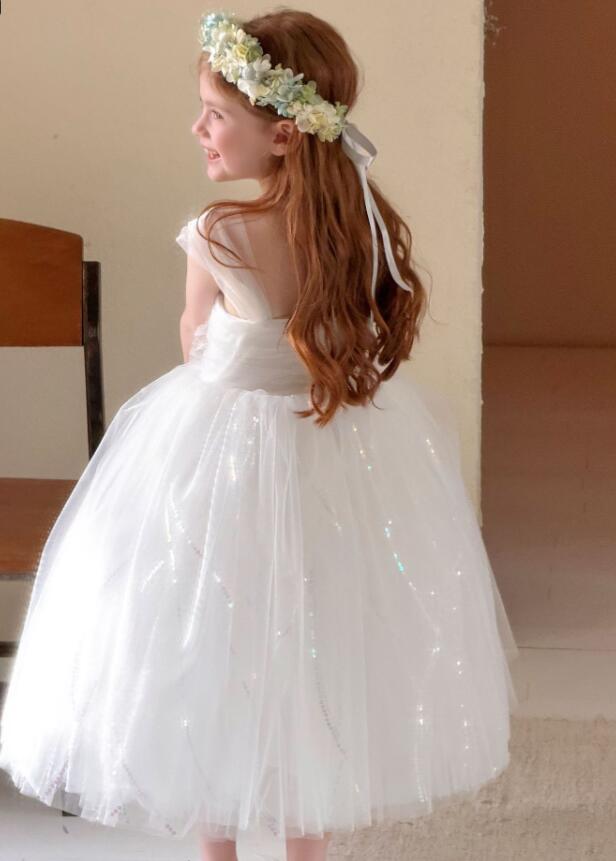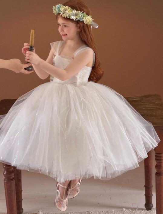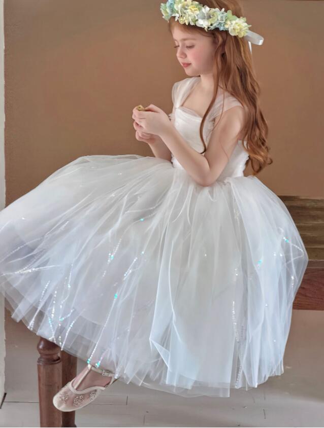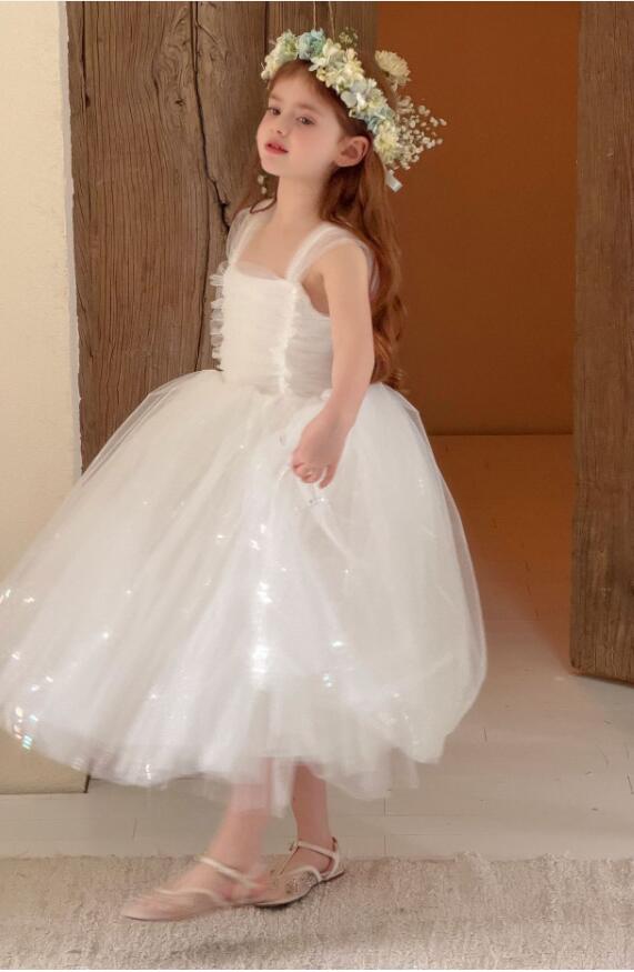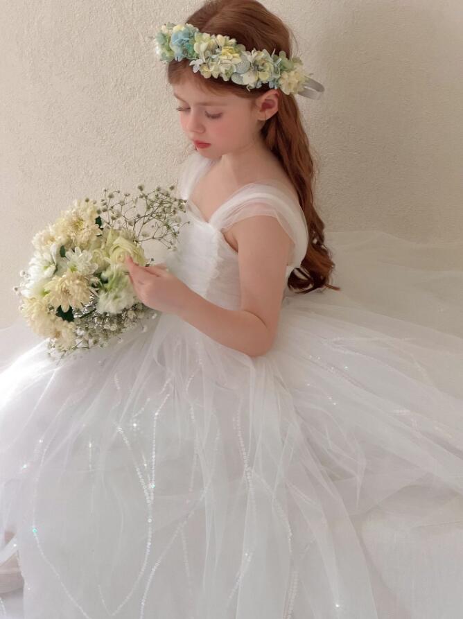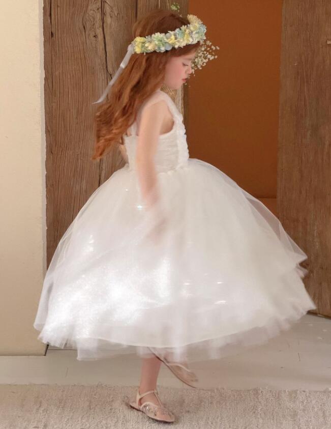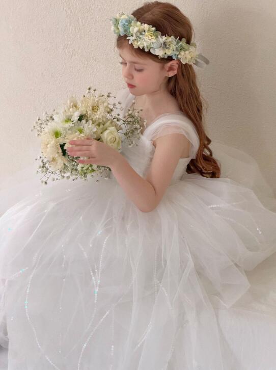 特別な日を彩るキッズ用の美しいロングワンピースです。 純白のチュール素材が上品で、ふんわりと広がるスカートが女の子らしさを演出します。 結婚式や発表会などのフォーマルシーンに最適で、90センチから130センチまで幅広いサイズをご用意しています。