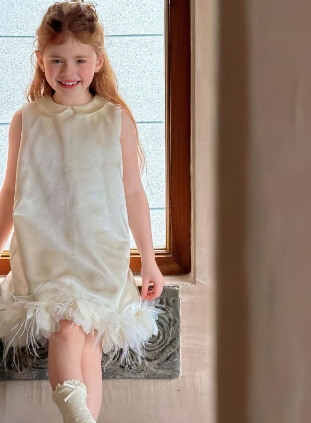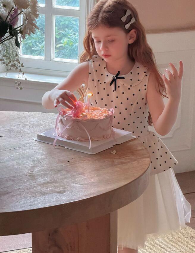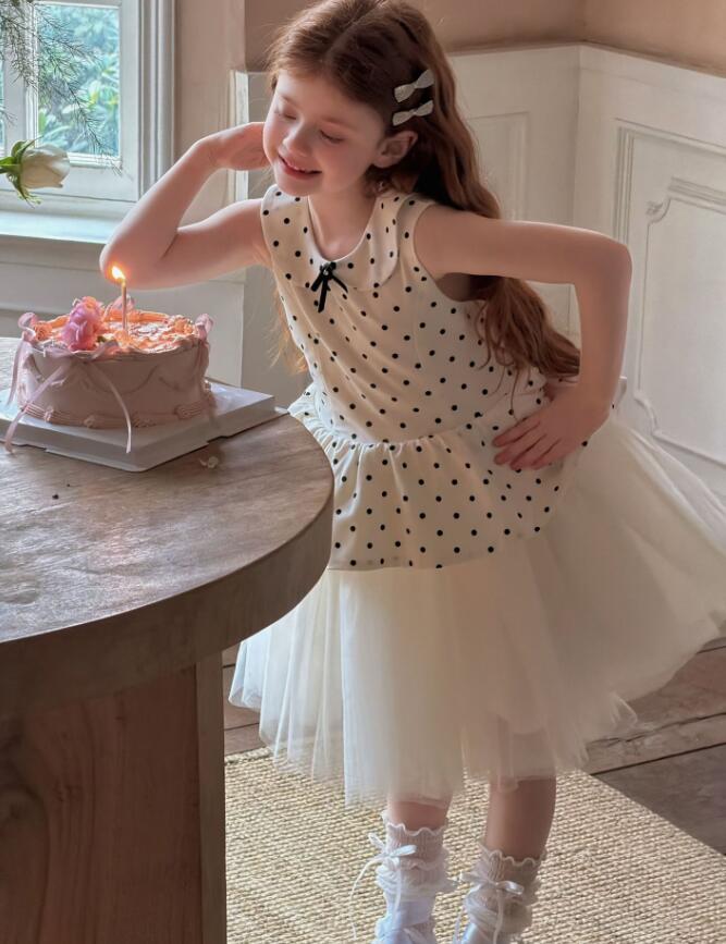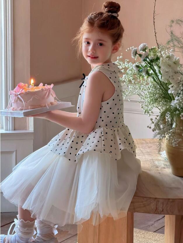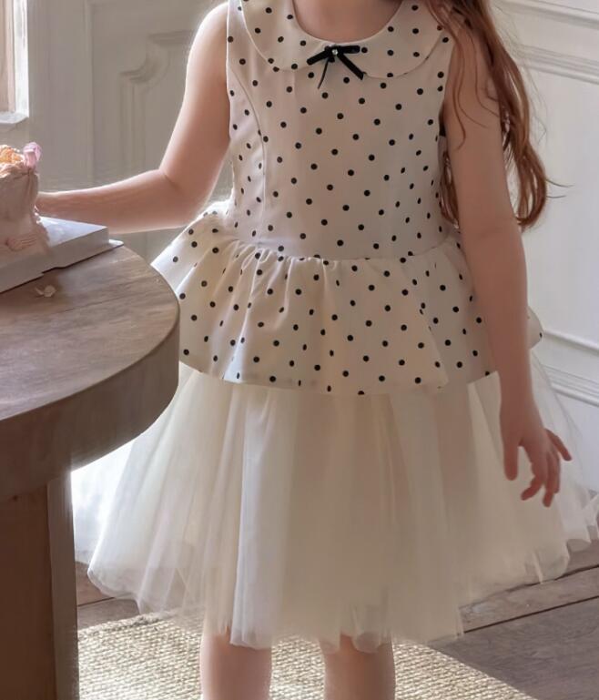 可愛い水玉模様が印象的なキッズ用ロングワンピースです。 上品なクリーム色ベースにブラックドットが映える、特別な日にぴったりのデザイン。 ふんわりとしたチュール素材で女の子らしさを演出し、 90センチから130センチまで幅広いサイズ展開でお子様の成長に合わせてお選びいただけます。