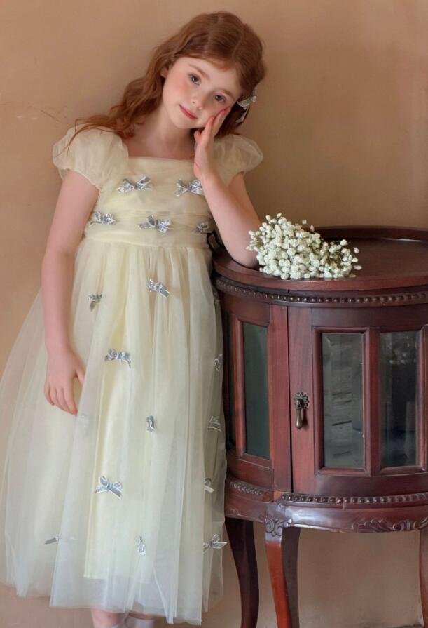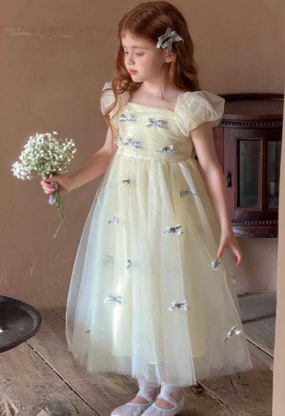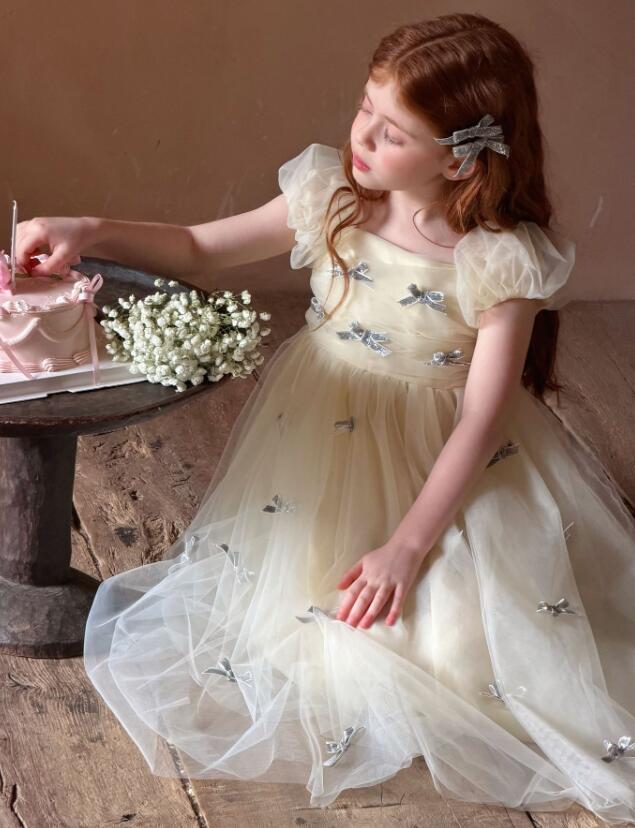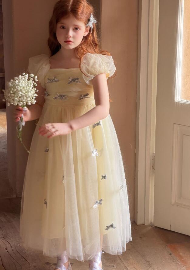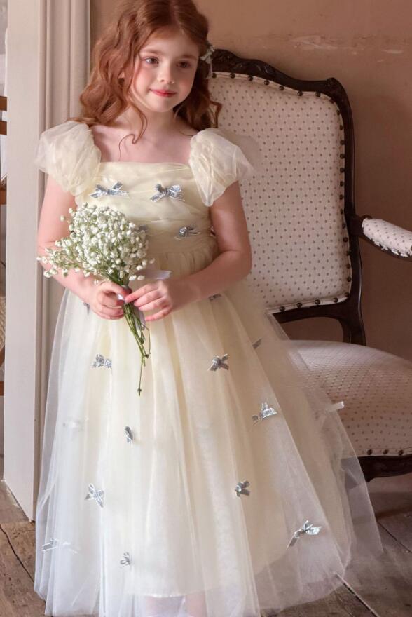 上品な花柄刺繍が美しいキッズ用ロングワンピースです。 淡いクリーム色の生地にパフスリーブと優雅なチュール素材を使用し、特別な日にぴったりの仕上がりです。 90センチから130センチまで対応で、発表会や結婚式などのフォーマルシーンにおすすめです。