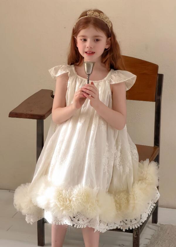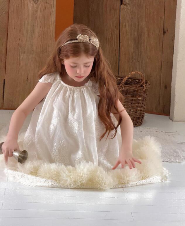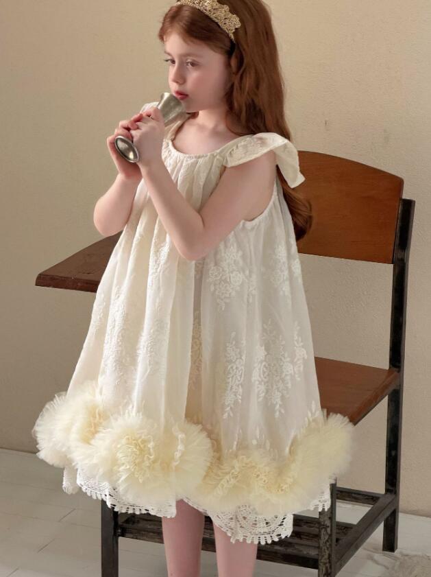 上品な白レースと繊細な刺繍が美しいキッズ用ロングワンピースです。
