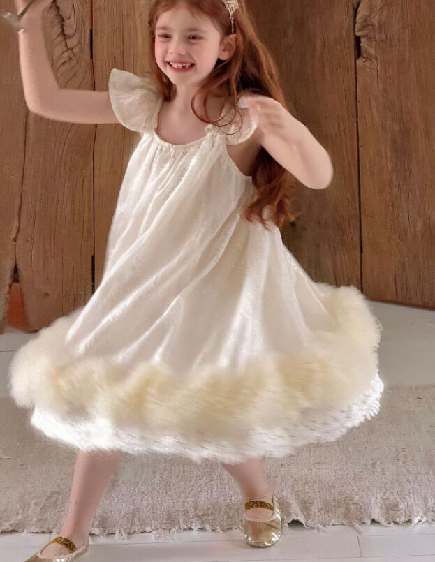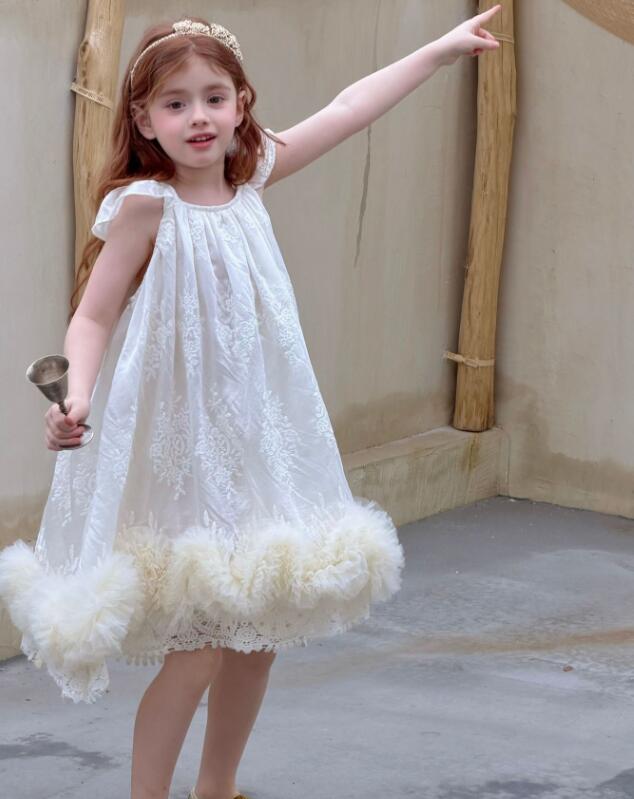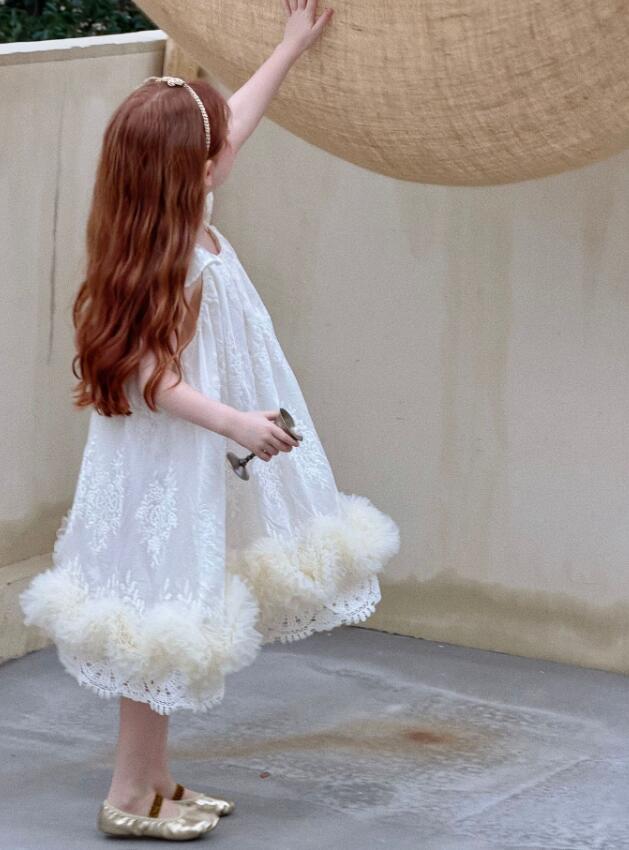 上品な白レースと繊細な刺繍が美しいキッズ用ロングワンピースです。 裾のふわふわチュール装飾が可愛らしさを演出し、特別な日にぴったり。 90センチから130センチまでサイズ展開豊富で、お子様の成長に合わせてお選びいただけます。