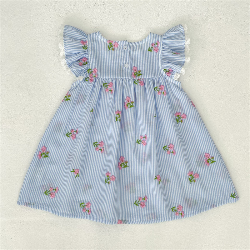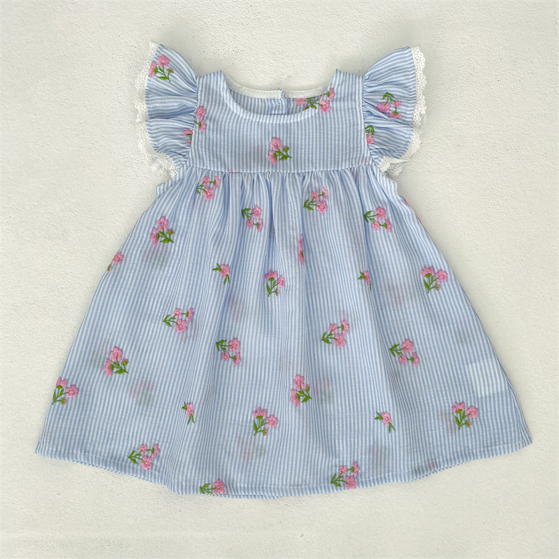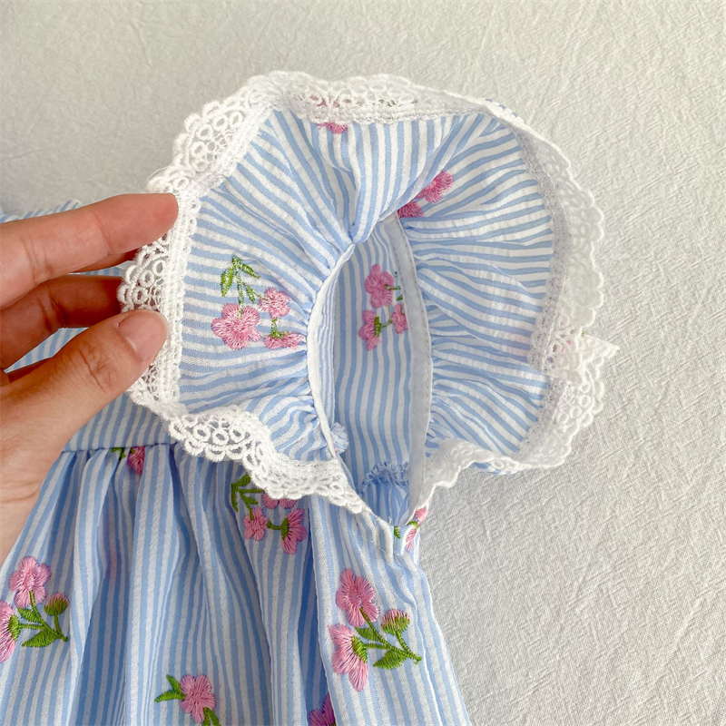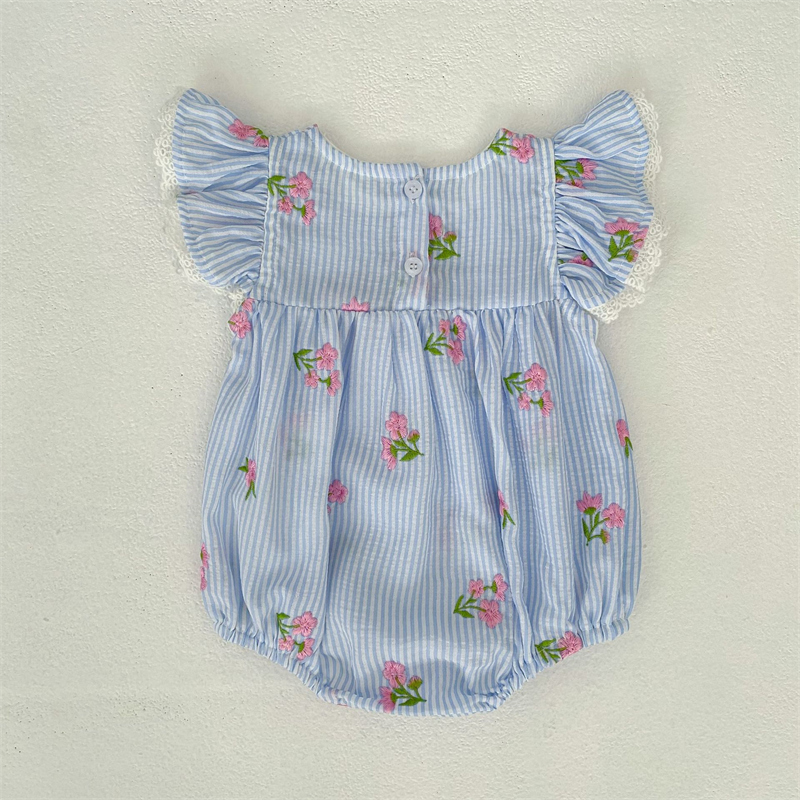 爽やかなストライプ地にピンクの花柄刺繍が上品な仕上がり。