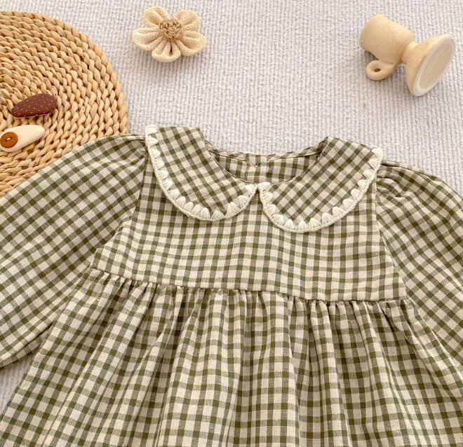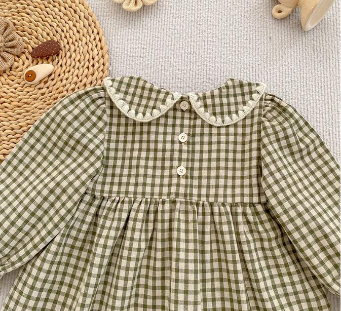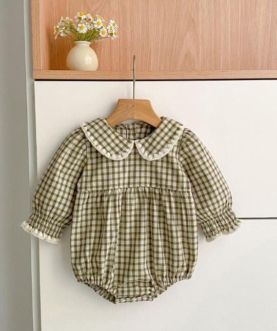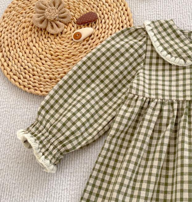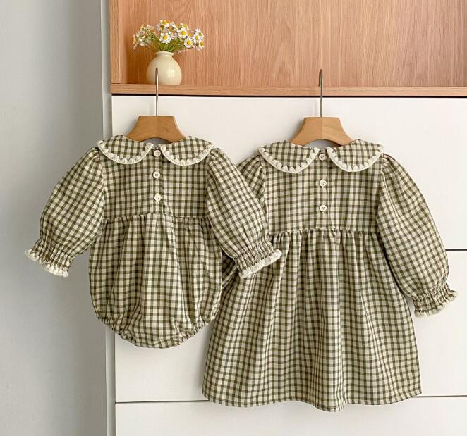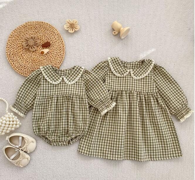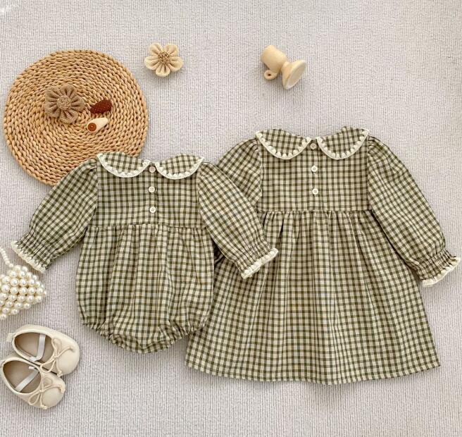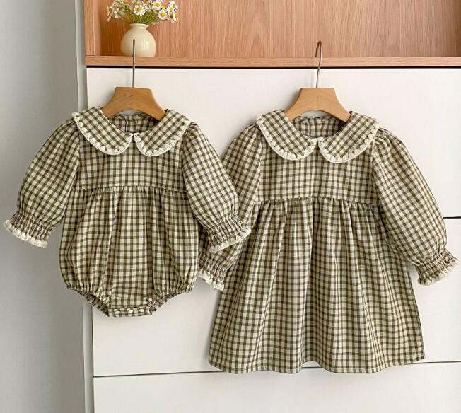 可愛いギンガムチェック柄のキッズ服セットです。 ロンパースとロングワンピースがセットになっており、姉妹でお揃いコーディネートが楽しめます。 丸襟とパフスリーブがとても上品で、お出かけにもぴったりな一着です。