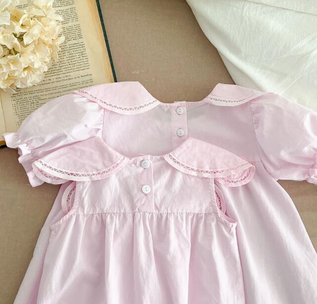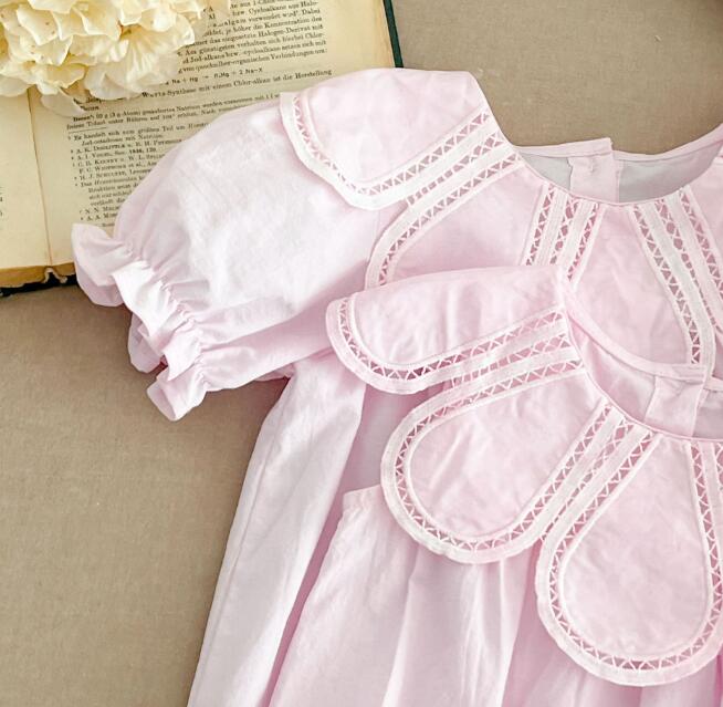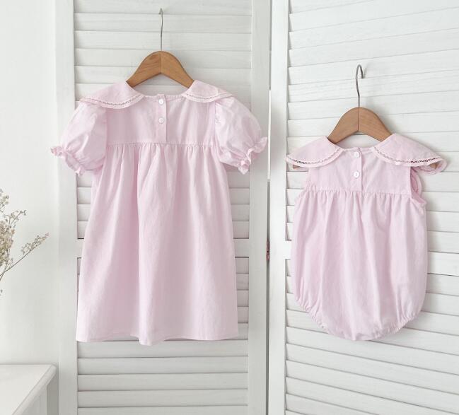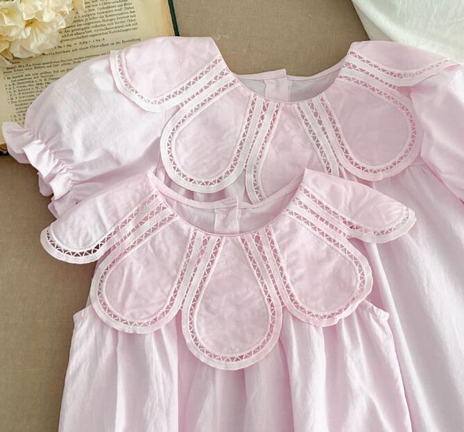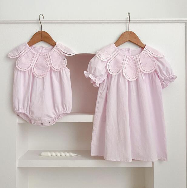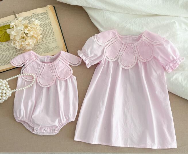 可愛い花びら襟が特徴的なキッズ向けロンパースとロングワンピースのセット商品です。 淡いピンク色で上品な仕上がりになっており、特別な日のお出かけにぴったりです。 ロングワンピースは程よい丈感で動きやすく、姉妹でお揃いコーディネートも楽しめます。