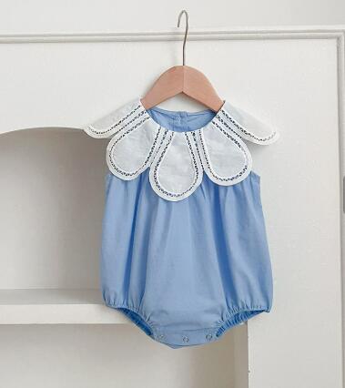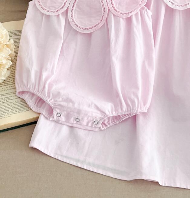 可愛い花びら襟が特徴的なキッズ向けロンパースとロングワンピースのセット商品です。